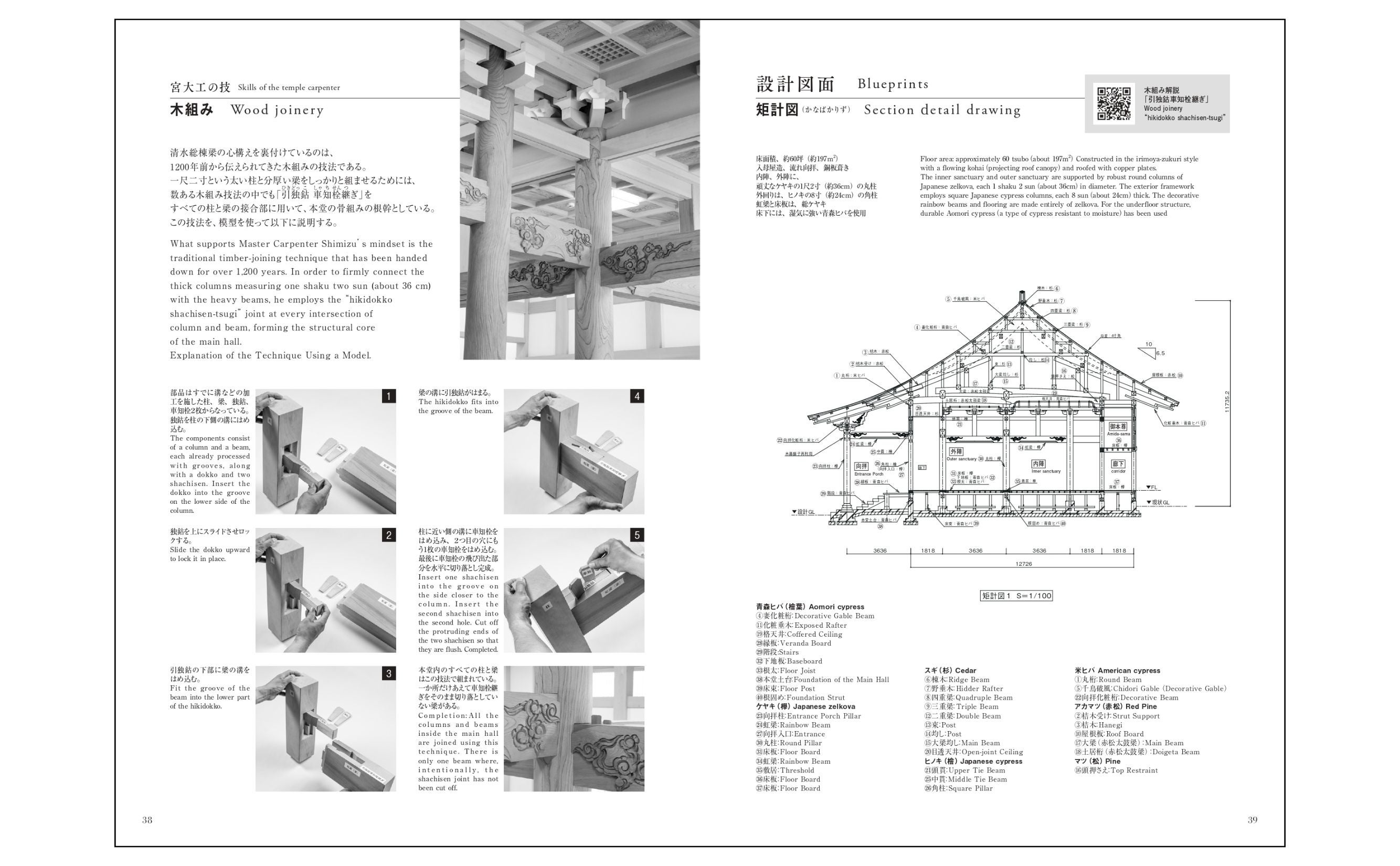 新本堂には無垢の材を用い、釘を使わない伝統的な工法で建てられています。500年先を見据えた、現代の名工でもある総棟梁、清水福治氏の深い造詣と経験、そして多くの宮大工の卓越した技の賜物です。その証ともいえる、新本堂に使われた木材のすべてを矩計図 (かなばかりず) で示し、木組みの技法解説も掲載しました。