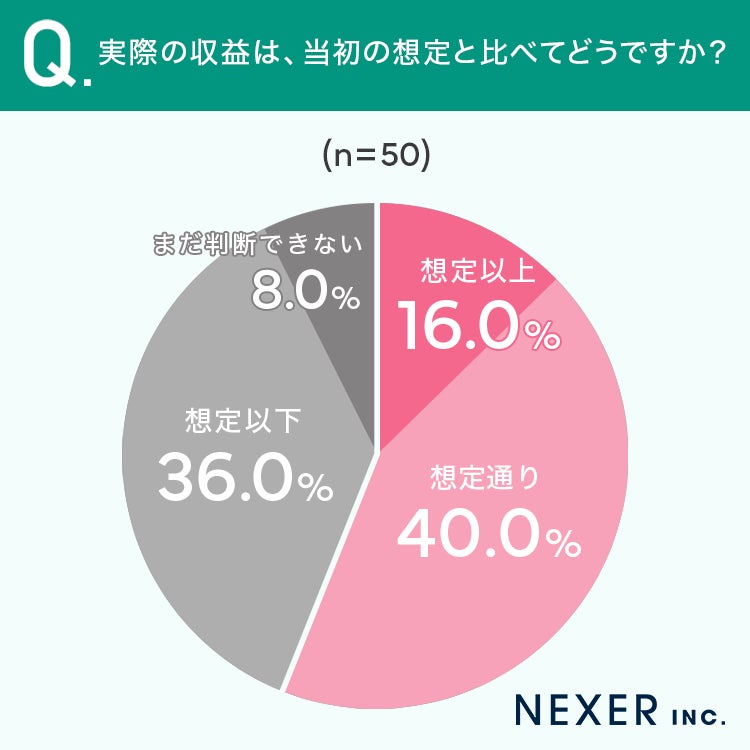 最も多かったのは「想定通り」で40%でした。次いで「想定以下」が36%となっています。「想定以上」は16%、「まだ判断できない」は8%でした。