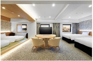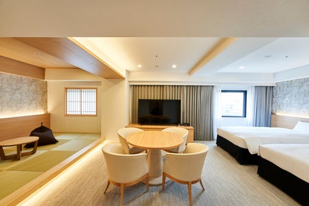 今回、小型犬と一緒に宿泊できる「スタイルツイン」や、プロジェクター完備で大画面の映像が楽しめる「シアターツイン」、3名まで宿泊できる「デラックスツイン」、そして畳の小上がりスペースを設けた、家族での宿泊にもおすすめの「ジュニアスイート~日和~」の4種類26室の客室を新設。また、既存の客室(241室)も壁・天井の壁紙や床のカーペットの張り替えなどを行い、落ち着きのある上質な空間にリニューアルしました。