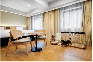 小型犬(10kg未満、2匹まで)と一緒に宿泊可能なペットフレンドリールームです。客室内にはペット用ベッド、ケージ、専用ゴミ箱など愛犬関連設備を揃えており、愛犬と一緒に快適にお過ごしいただけます。