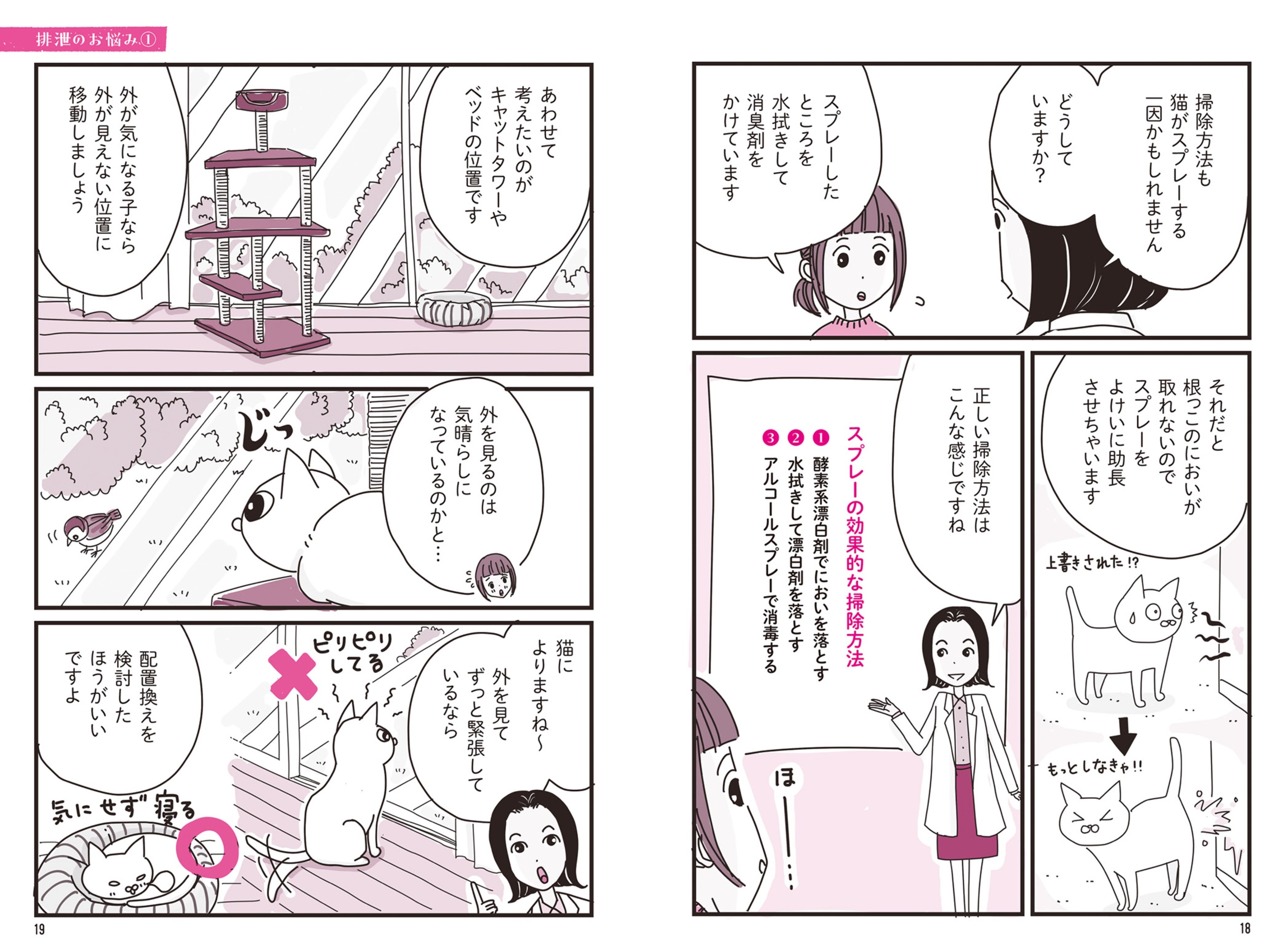 本書は、そういった猫の飼い主さんから寄せられたお悩みや質問に、動物行動学者の茂木千恵先生がずばり答えるマンガ仕立ての猫本です。リアルな実例20ケースは、「猫あるある」なエピソードばかり。