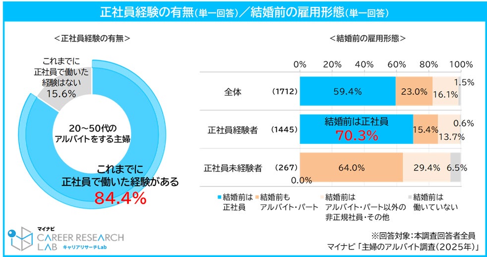 アルバイト就業中の20~50代の主婦に、これまでの正社員就業経験を聞いたところ、経験があると回答した人は84.4%となり8割を超えた。