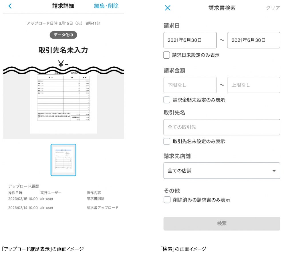 このたび『Airインボイス』は、電帳法で定められた保存要件に従い、撮影・アップロード・削除などの操作履歴を記録・表示する「アップロード履歴表示」、請求日・取引金額・取引先名での検索が可能になる「検索」を新機能として追加いたします。
