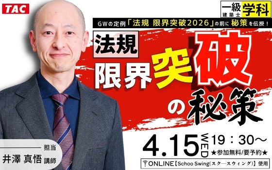 当セミナーでは、GWの前に、法規限界突破、法規一発逆転のための、とっておきの「秘策」=得点アップのための一歩踏み込んだ内容を伝授します!GWには、TAC「法規限界突破」シリーズ「①法規特訓テスト、②法改正出題予想講座、③告示出題予想講座」もご用意していますので、そちらもご検討ください。
