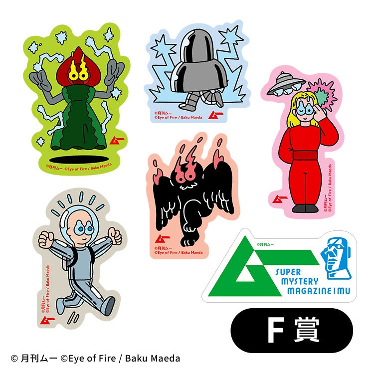 人気イラストレーター・アーティストの前田麦氏のライフワークである、燃える目を持つ「Eye of Fire」シリーズと「ムー」が初コラボ。燃える目を持つUMAや宇宙人たちが登場します。アクリルスタンドや「ムー」で売れ筋のビッグTシャツなど普段使いできる商品を中心に、たくさんのファンの方に楽しんでいただけるラインアップを取り揃えました。ラスト賞は歴代の表紙画像を使用したモザイクアクリルボードで特徴的なロゴを再現しており、「ムー」のこだわりが詰まっています。