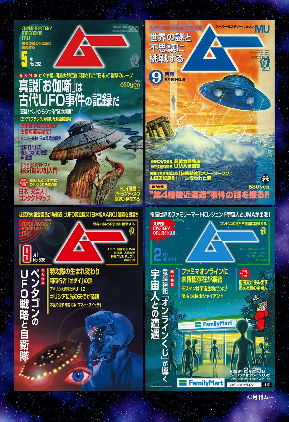 ファミリーマートを題材にした描きおろしデザインや、UMA/UFO/宇宙/古代を使用した「ムー」編集部セレクトの歴代表紙デザインのステッカーをファミマプリントで発売します。お気に入りの表紙といつでもどこでも一緒に過ごせます。