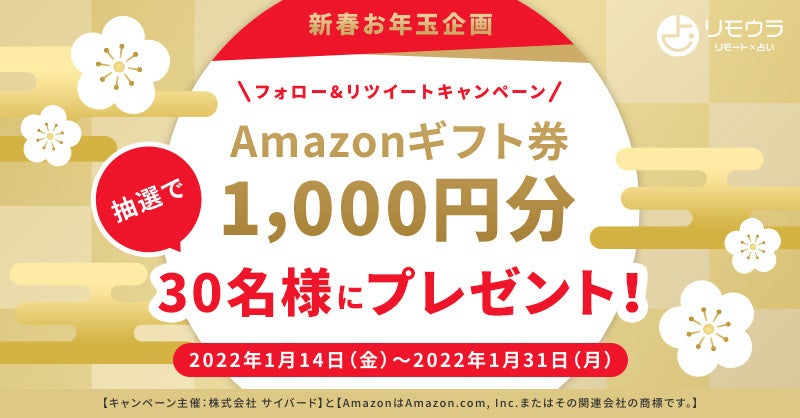 株式会社サイバード(本社:東京都渋谷区、代表取締役社長 兼 CEO 本島 匡、以下「サイバード」)は、オンライン占い対面鑑定サービス「リモウラ」(https://remoura.com/)の新春お年玉企画として、プレゼントキャンペーンを実施します。