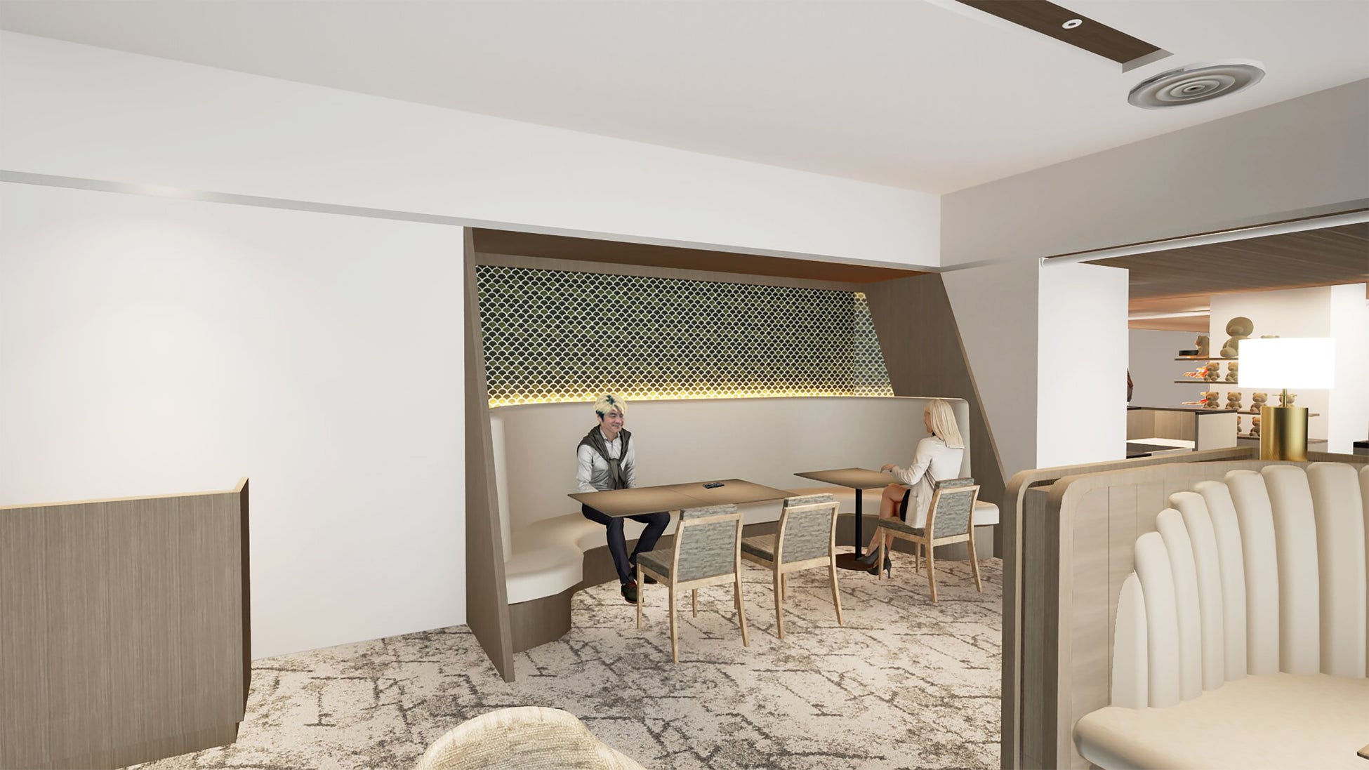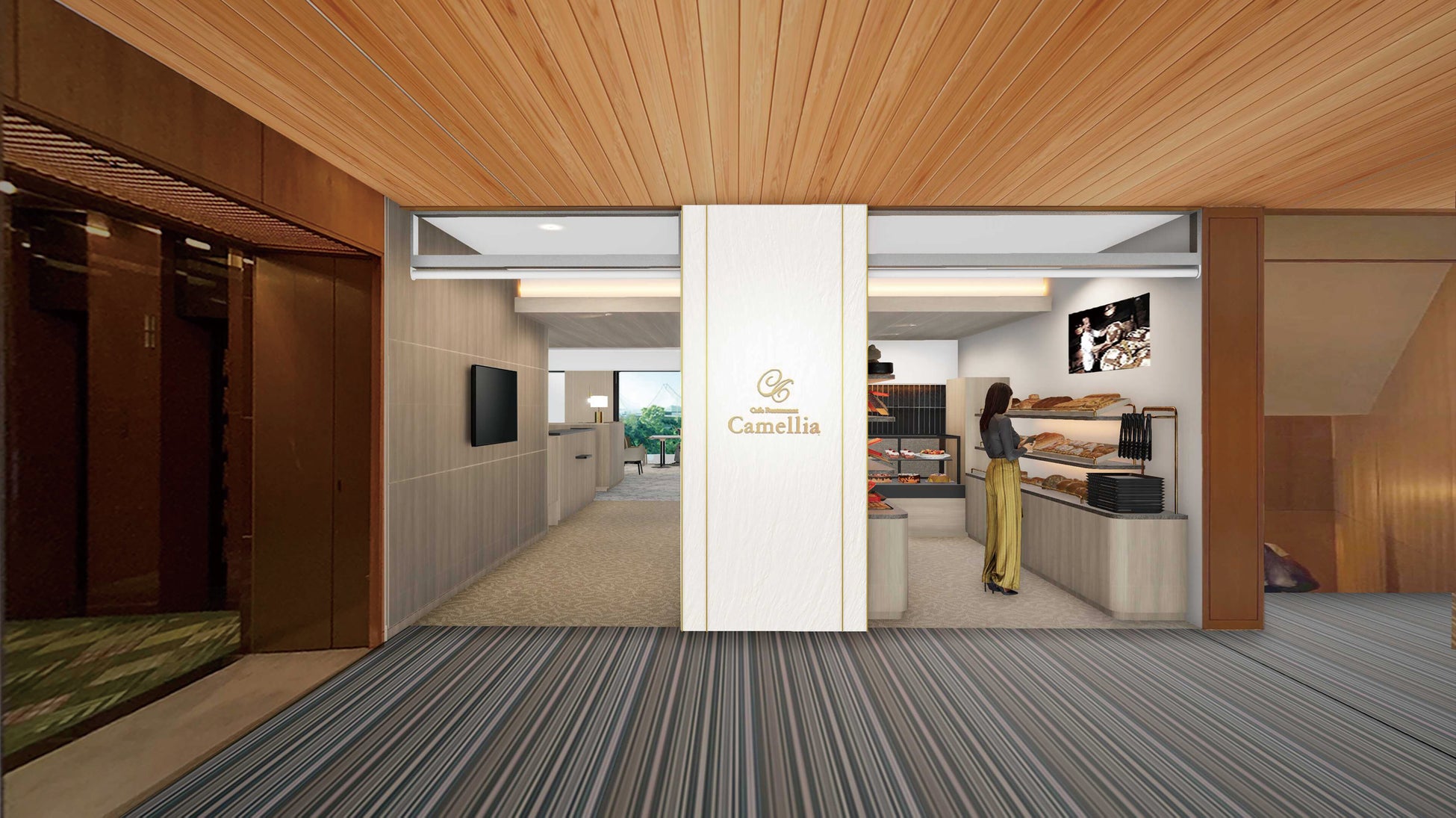 白を基調としたホール席は、神戸港を望む大きな窓から自然光が差し込む明るい空間。柱の木目にゴールドを使用するほか、アクセントにグレージュとダークグレーでまとめたテーブルとイスを設置します。さらに、半個室を設けることで、ご家族でのお食事やビジネスシーンなど、より多様なご要望にお応えします。また、エントランス横にはテイクアウトコーナーを設け、ホテルメイドのケーキやパンをはじめ、ご自宅用から手土産まで幅広くご利用いただける商品をご用意しています。