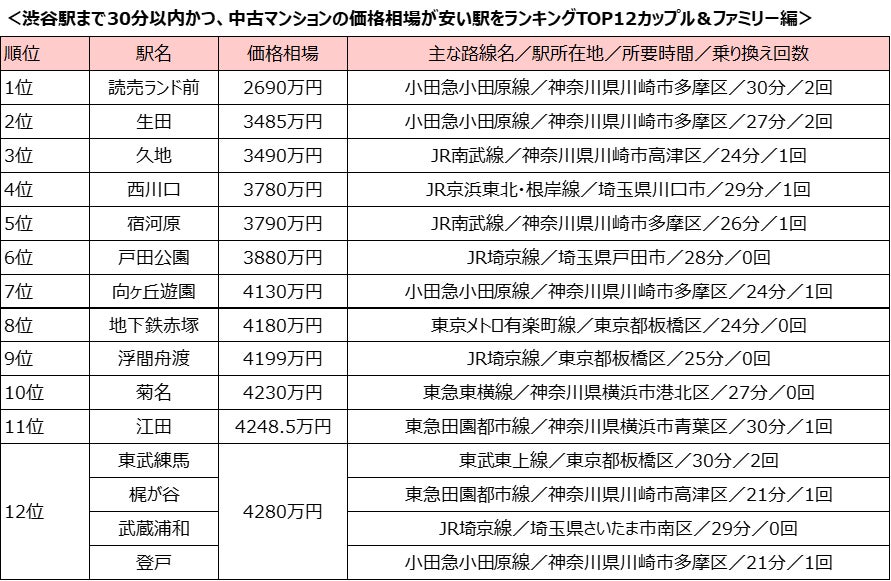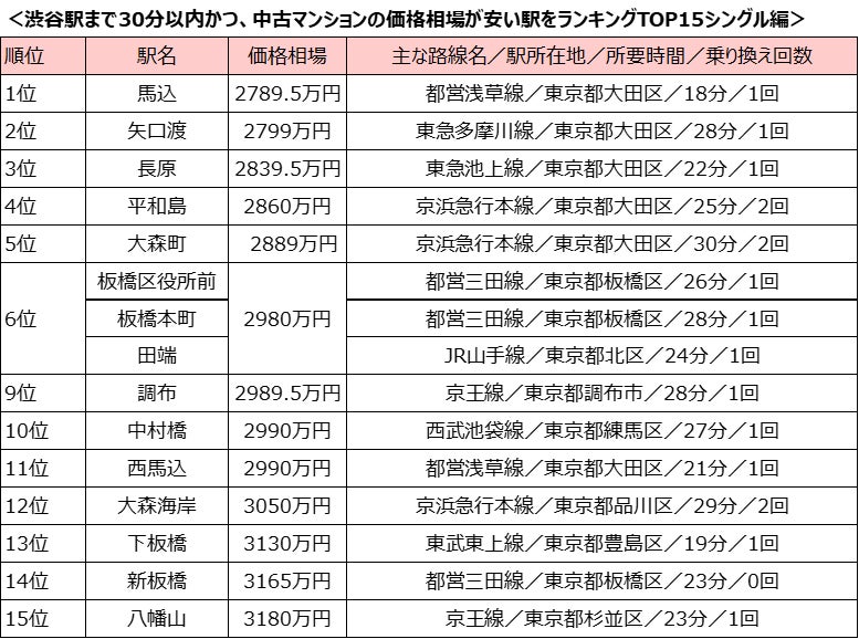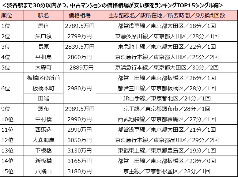 「渋谷駅」まで30分以内、中古マンション価格相場が安い駅ランキング!「シングル向け」のランキングは大田区の駅がベスト5を独占~SUUMOジャーナル調査~