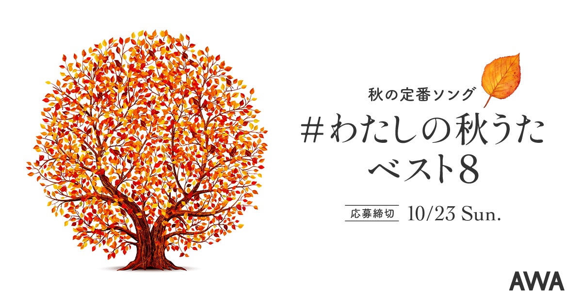 AWA株式会社(本社:東京都港区、代表取締役CEO:冨樫晃己)が運営する、サブスクリプション型(定額制)音楽ストリーミングサービス「AWA(アワ)」は、紅葉、ハロウィン、ひと夏の恋などをテーマに、この秋に聴きたい楽曲を募集する、人気のプレイリスト作成キャンペーン「#わたしの秋うたベスト8」を2022年10月14日~10月23日に開催いたします。さらに、期間中に定期配信アーティストのあさちる、平岡優也、鹿の一族が、“秋うた”をテーマにしたラジオ配信ラウンジを開催。