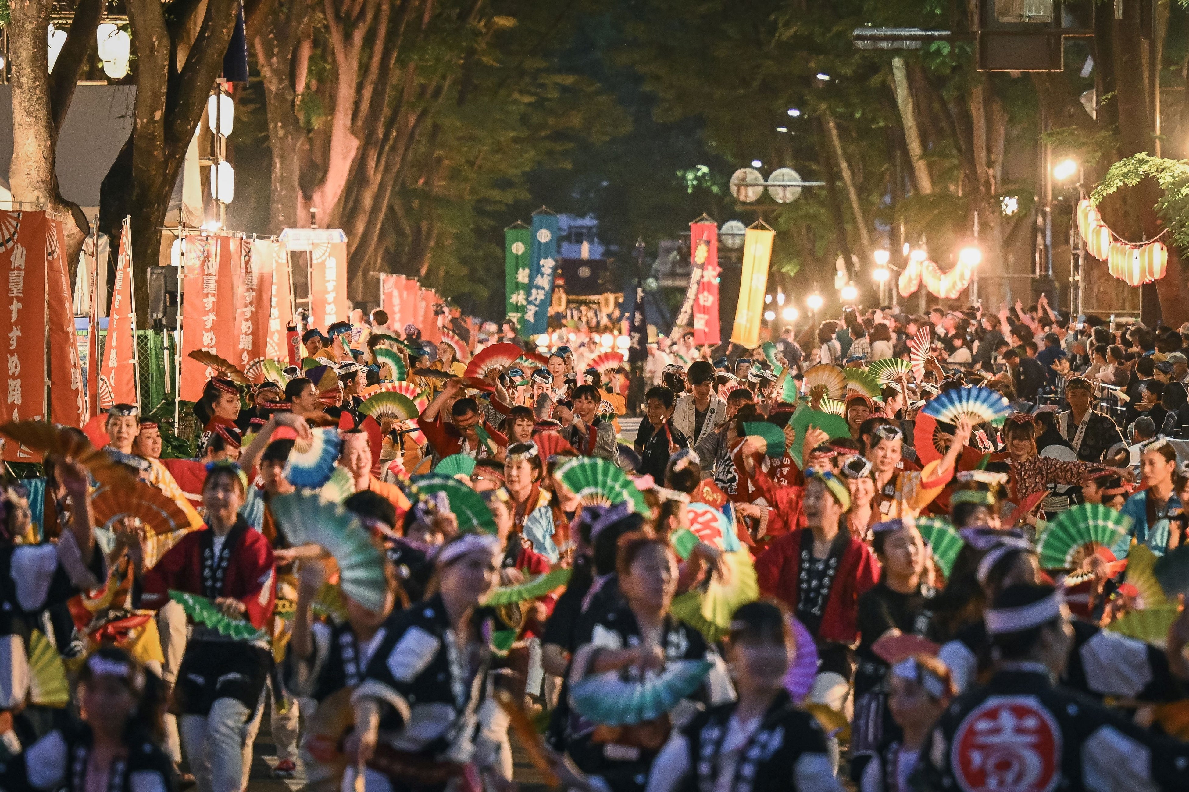 祭りが最高潮に達するのは、宵まつり夜の部にあるフィナーレです。何十もの祭連が途切れることなく舞い歩く「大流し」は、踊り子と観客の熱気がぶつかり合う圧巻の光景。最後は誰もが主役になれる「総踊り」が待っています。ぜひ「飛び入り雀」として輪に加わり、共に跳ねてみてください。
