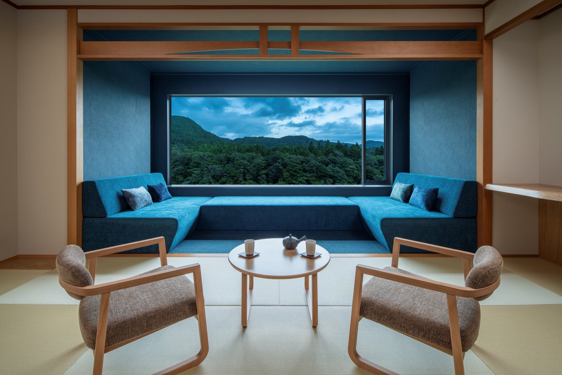 14:30 界 秋保の客室にチェックイン。名取川を望む空間で一息