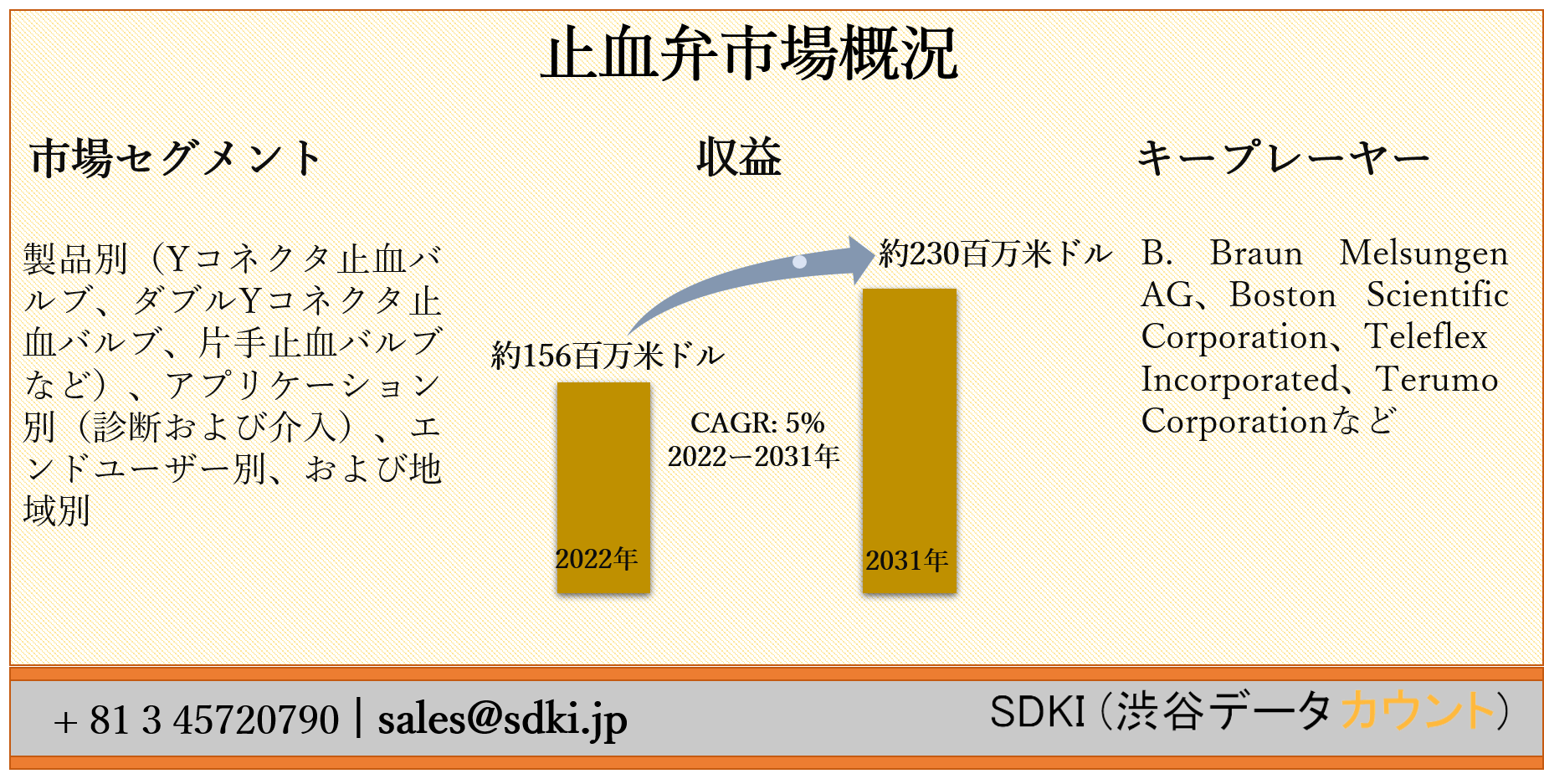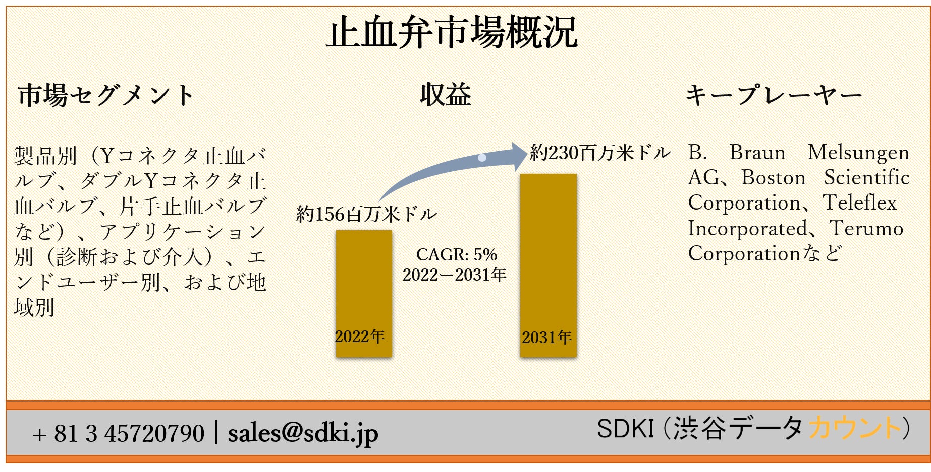 SDKI Inc.は、「止血弁市場ー世界の予測2022ー2031年」新レポートを 2022年04月01日に発刊しました。この調査には、止血弁市場の成長に必要な統計的および分析的アプローチが含まれています。レポートで提供される主要な産業の洞察は、市場の既存のシナリオに関する読者に市場の概要についてのより良いアイデアを提供します。さらに、レポートには、市場の成長に関連する現在および将来の市場動向に関する詳細な議論が含まれています。