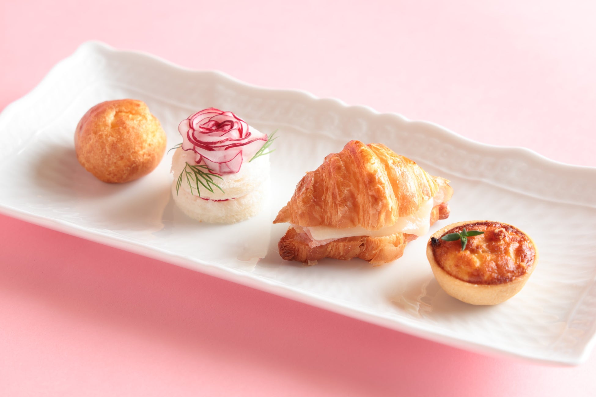 セイヴォリーは、「ミニクロワッサンのクロックムッシュ」や「グリュイエールチーズのグジェール」など、フランスのエスプリを感じさせるメニューをご用意しました。甘さと塩味の絶妙なバランスが、ティータイムのひとときをより豊かに彩ります。