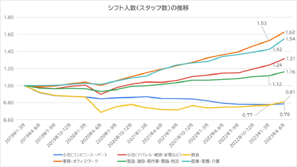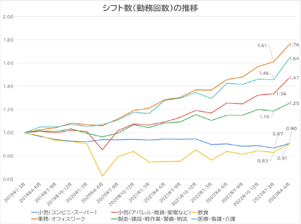 計を1.0として指数化し、シフト数がどのように増減しているか四半期ごとの推移を比較した。