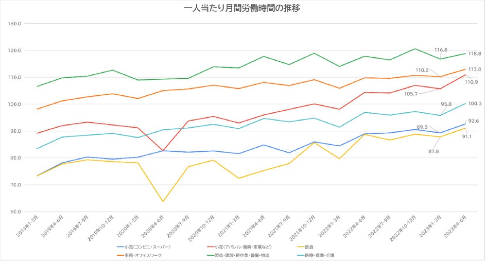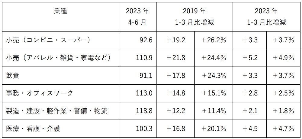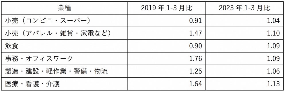「小売(コンビニ・スーパー)」「小売(アパレル・雑貨・家電など)」「飲食」「製造・建設・軽作業・警備・物流」「事務・オフィスワーク」「医療・看護・介護」の6業種における、新型コロナウイルスの感染拡大前の2019年1月から2023年6月までの推移データを発表致します。