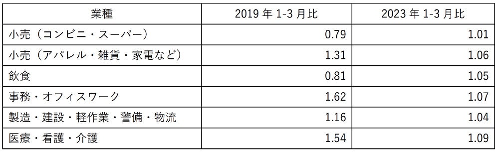 ・ 逆に、コロナ前と比較して、シフト数とシフト人数が下がったのは、「小売(コンビニ・スーパー)」(それぞれ0.91倍と0.79倍)と「飲食」(それぞれ0.90倍と0.81倍)だった。