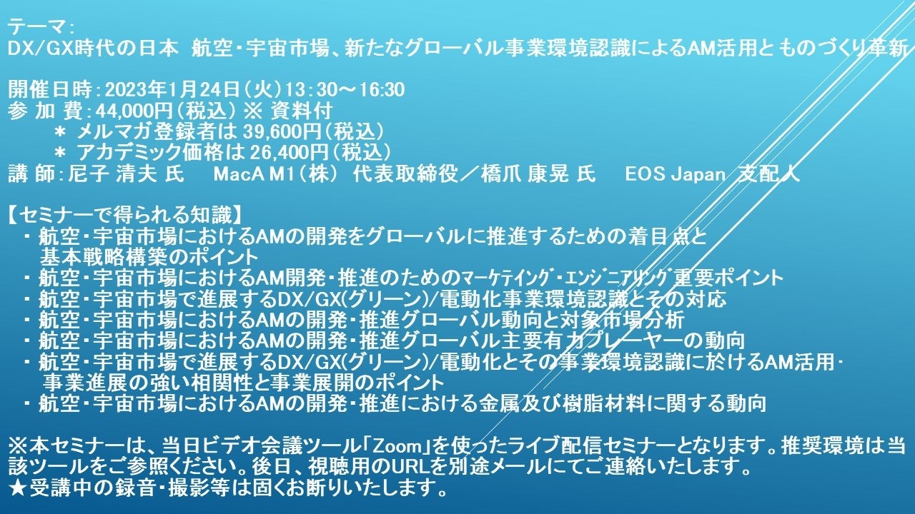 【ライブ配信セミナー】DX/GX時代の日本 航空・宇宙市場、新たなグローバル事業環境認識によるAM活用と ものづくり革新 1月24日(火)開催 主催:(株)シーエムシー・リサーチ