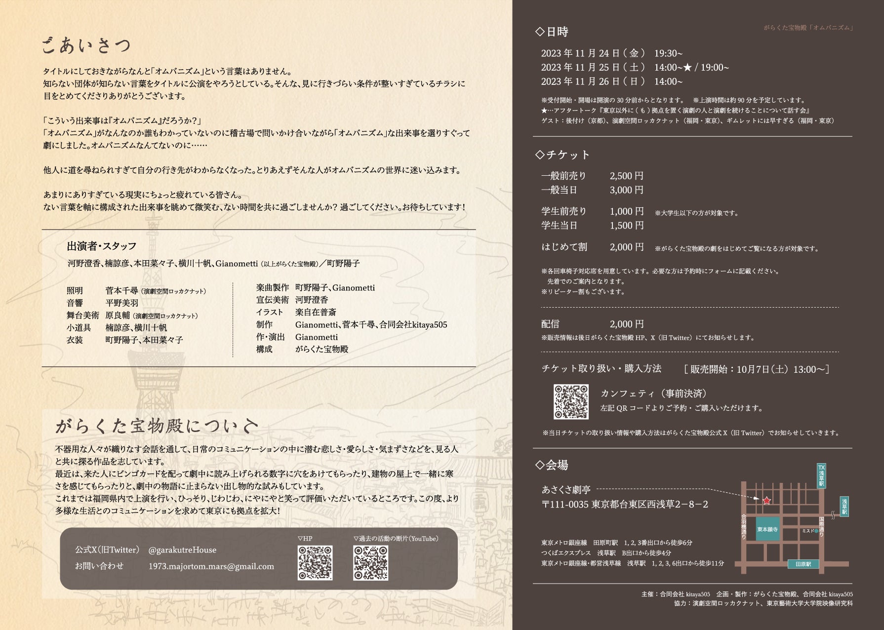 今回は、はじめてがらくた宝物殿を見る人に向けた「はじめて割」も実施。 劇のタイトルは「オムバニズム」だ。タイトルにしておきながら「オムバニズム」という言葉はない。 ないのに「こういう出来事は『オムバニズム』だろうか?」と稽古場で問いかけ合いながら「オムバニズム」な出来事を選りすぐって劇にした。 世の中があまりに「ありすぎ」ていてなんでも社会に直接役立つことが強く求められる中、「ない」あるいは「なくてもよい」ことにわざわざ立ち止まり微笑むことを志した劇となっている。