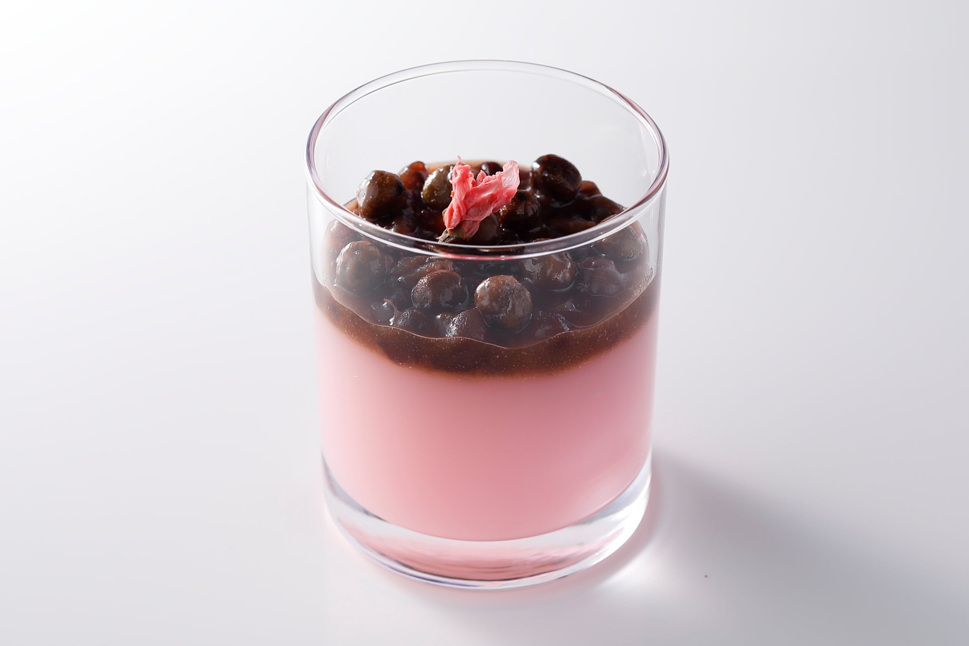 口どけの良い寒天とさくら寒天の2種類を5日間かけてじっくりと煮込んだ丹波産の黒豆とあわせた、寒天の透明感が映える鮮やかなお花見スイーツ。付け合わせの黒蜜あんこ・塩えんどう豆を加えることで、優しい甘さが引き立ち、味わいの変化もお愉しみいただけます。