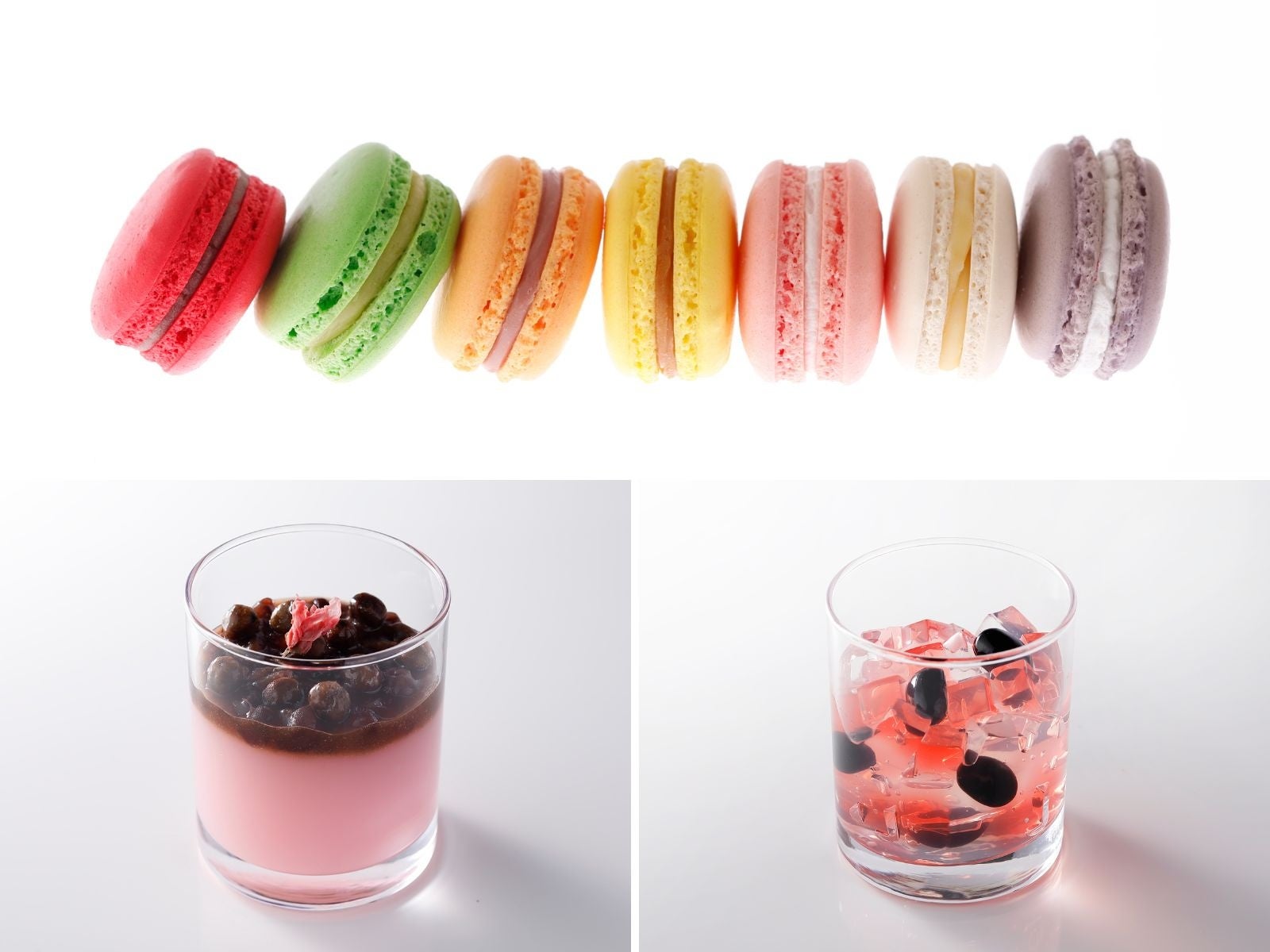 ①「桜マカロン」桜リキュールを加えたこしあん、塩漬けした桜