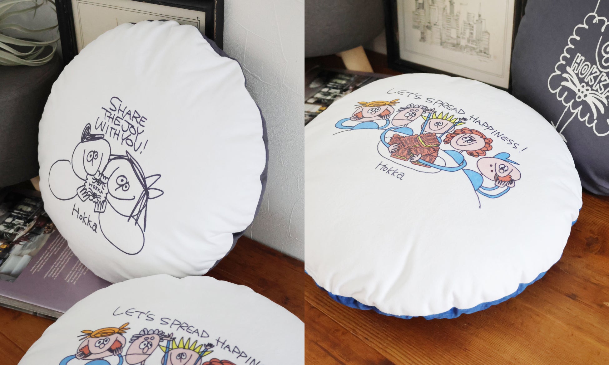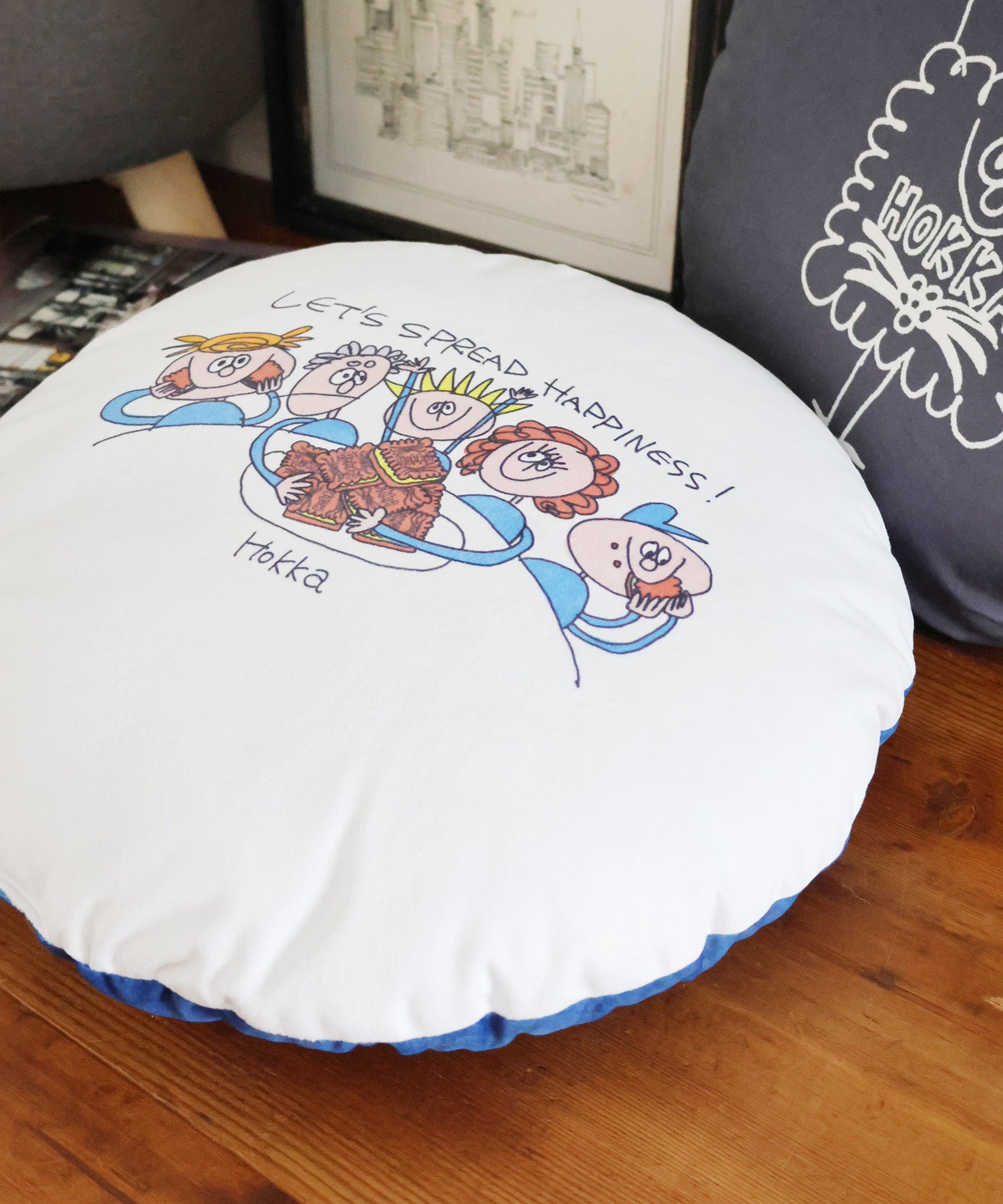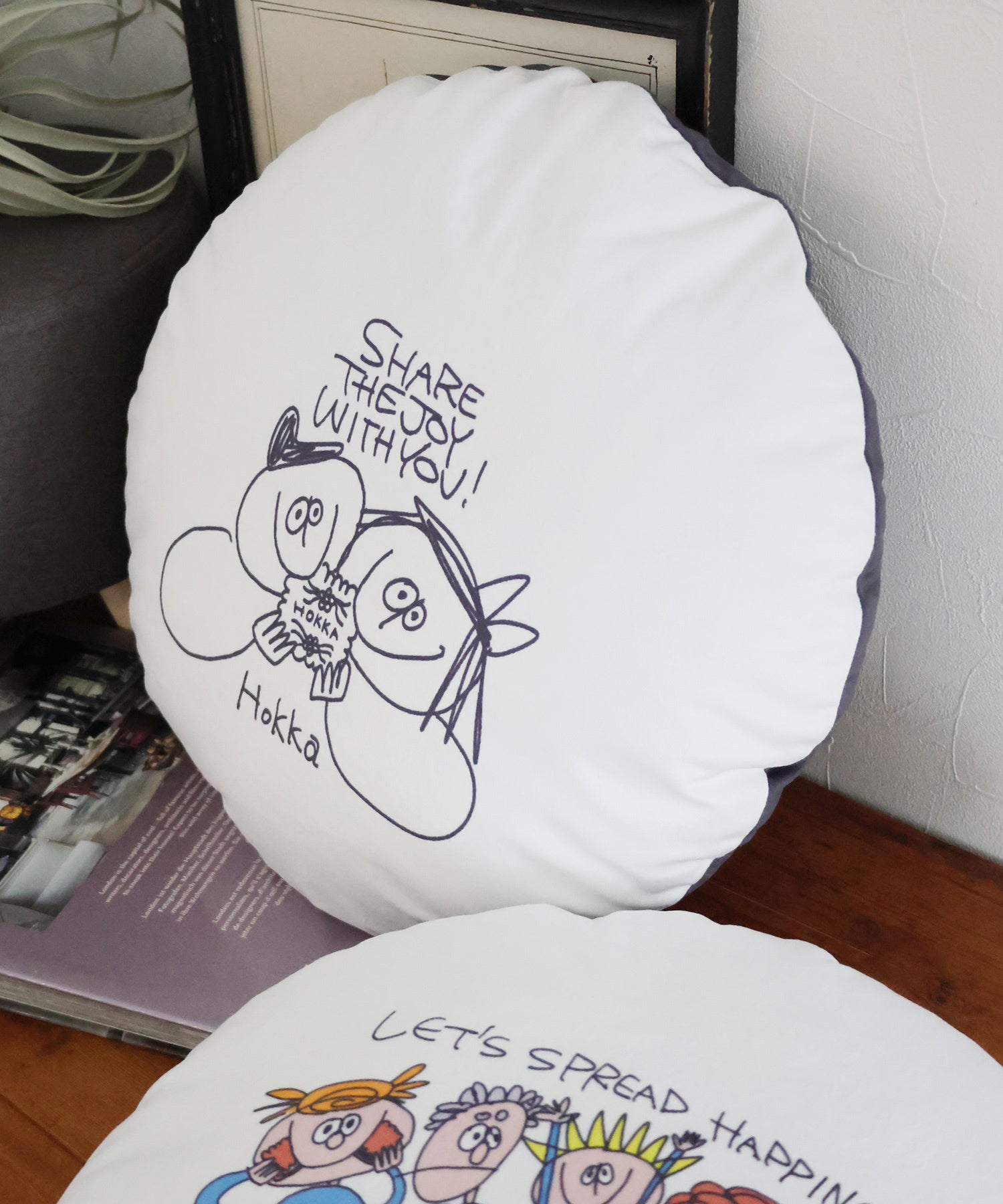 オガワナツミさんに限定で描いて頂いたイラストが両面に施されたラウンドクッション。カラーによって異なるイラストなので2色揃えるのもおすすめです。