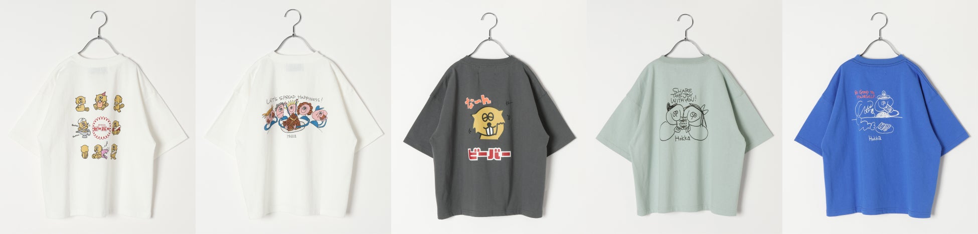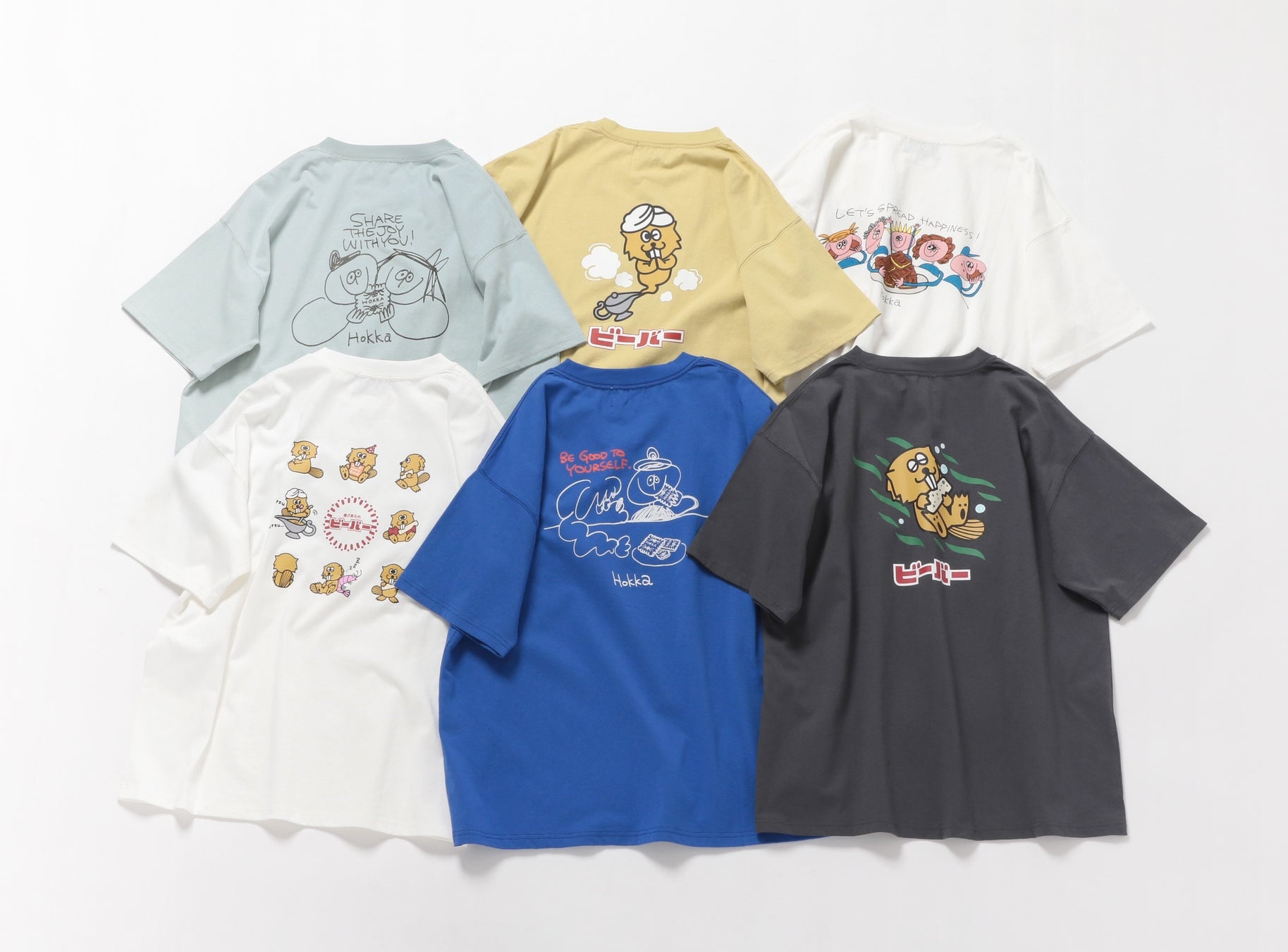 「hokka」とのコラボレーションアイテム8型は、世代を超えて愛されるビスケットのイラストや、北陸のソウルフードである揚げあられ「ビーバー」のキャラクターをモチーフにしたTシャツやクッション、キッズウェアなどを展開します。