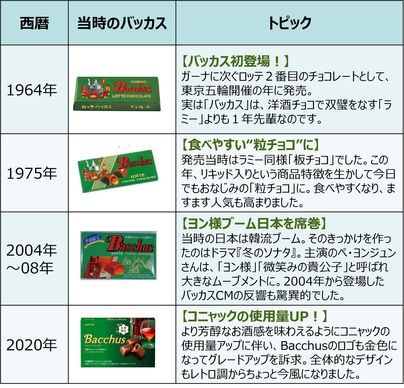 1964年、ロッテチョコレート事業黎明期に誕生した「バッカス」。現在にいたるまでのトピックスを簡単にご紹介します。