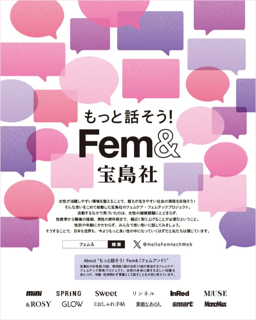 ファッション雑誌販売部数14年連続トップシェア(※)の株式会社宝島社による、フェムテック・フェムケア啓発プロジェクト「もっと話そう! Hello Femtech(ハローフェムテック)」のプロジェクト名を「もっと話そう! Fem&(フェムアンド)」に変更します。