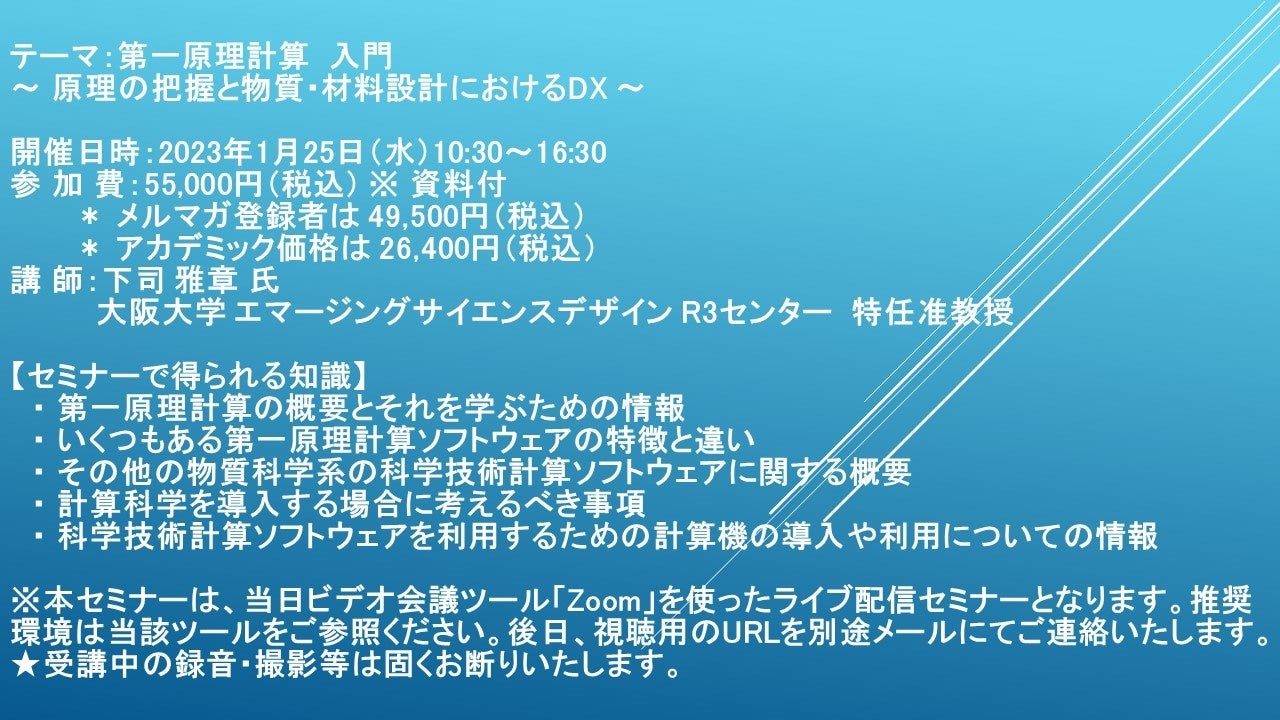 先端技術情報や市場情報を提供している(株)シーエムシー・リサーチ(千代田区神田錦町: https://cmcre.com/ )では、 各種材料・化学品などの市場動向・技術動向のセミナーや書籍発行を行っておりますが、 このたび「第一原理計算 入門 ~ 原理の把握と物質・材料設計におけるDX ~ 」と題するセミナーを、 講師に下司 雅章 氏 大阪大学 エマージングサイエンスデザイン R3センター 特任准教授)をお迎えし、2023年1月25日(水)10:30より、 ZOOMを利用したライブ配信で開催いたします。 受講料は、 一般:55,000円(税込)、 弊社メルマガ会員:49,500円(税込)、 アカデミック価格は26,400円(税込)となっております(資料付)。