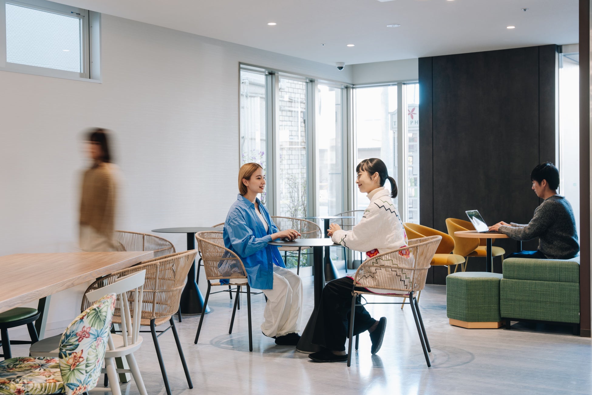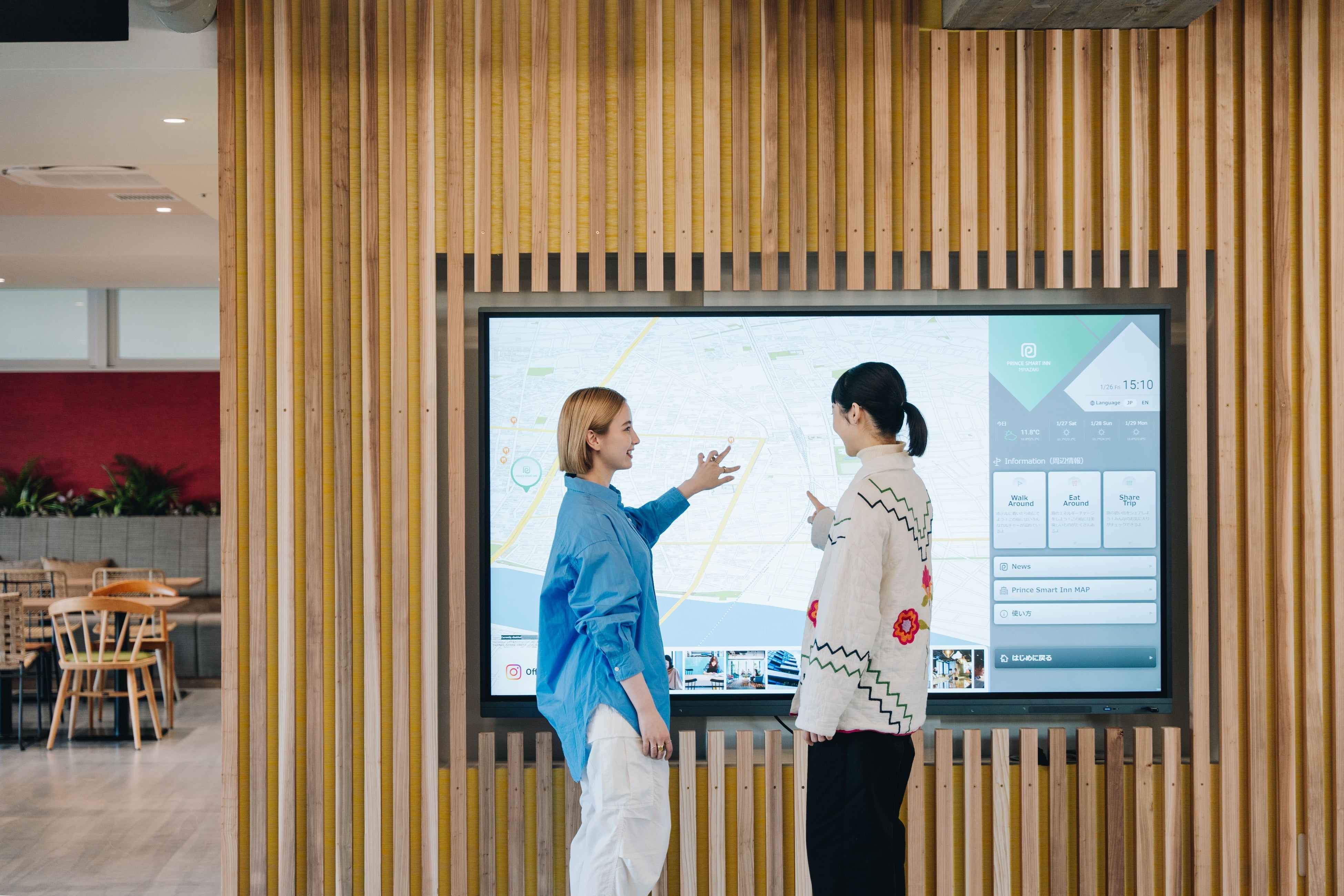 ホテルのエントランスからロビーにかけてはシームレスな空間をイメージし、ロビーエリア、チェックインエリアが1つの空間になるようにデザインをしております。明るく広々とした空間には顔認証でのチェックインにも対応した自動チェックイン機や、付近の観光情報やグルメ情報を提供する他、お客さま同士のコミュニケーションツールとしてもご利用いただけるマップ型デジタルサイネージを設置しています。