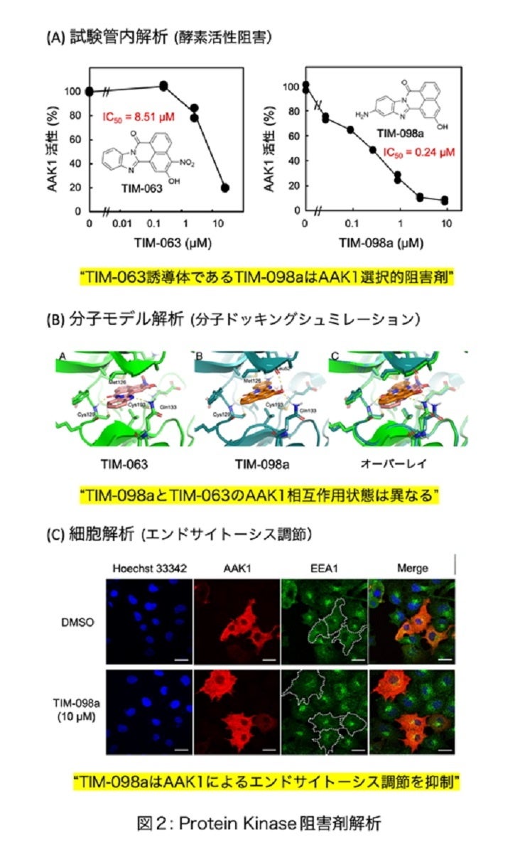 国立大学法人岡山大学(本部:岡山市北区、学長:那須保友)学術研究院ヘルスシステム統合科学学域の德光浩教授の研究グループと学術研究院教育学域の石川彰彦教授の研究グループは、学術研究院ヘルスシステム統合科学学域の佐藤あやの准教授、自然生命科学研究支援センターの砂月幸成准教授、スウエーデンのルンド大学のUlf J. Nilsson教授との国際共同研究により、機能プロテオミクス、有機合成化学、生化学、細胞生物学、分子ドッキングシミュレーションを用いることで、既存のタンパク質リン酸化酵素阻害剤からリン酸化酵素AAK1 に対する新たな選択的阻害剤の開発に成功しました。