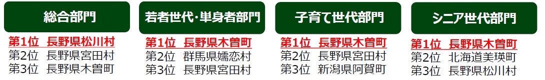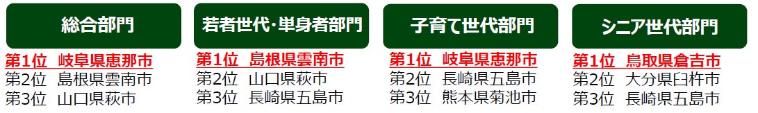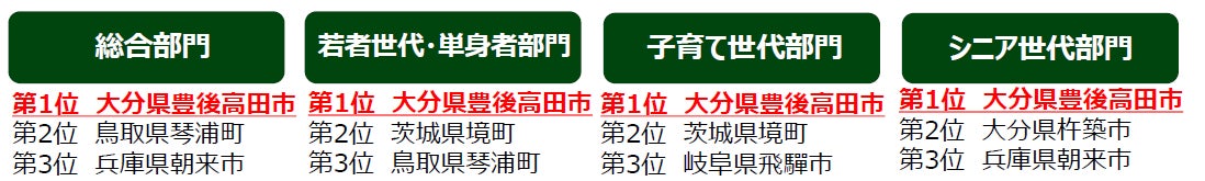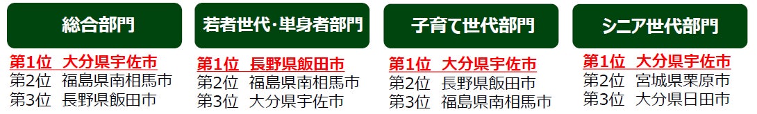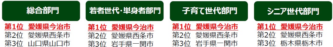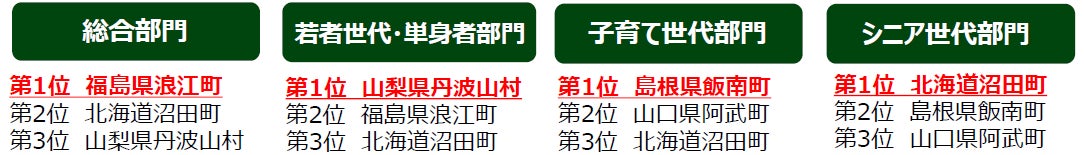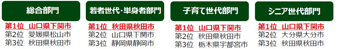 そのほか「人口1万人以上3万人未満のまち」では大分県豊後高田市が5年連続全部門1位を獲得し、13年連続ベスト3入りを果たし、「人口10万人以上20万人未満のまち」では愛媛県今治市が、3年連続で4部門すべての1位を獲得。また、「人口5000人未満のまち」では福島県浪江町が2年連続で総合部門1位、「人口20万人以上のまち」では山口県下関市が総合部門、子育て世代部門、シニア世代部門の3部門で1位を獲得しました。