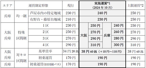 弊社では、2023年8月1日付で大阪・兵庫エリアにおける一般乗合バスの上限運賃変更認可を受け、同年9月1日に同エリアで運賃改定を実施いたしました。その際、お客様への影響を考慮し、認可を受けた上限額まで段階を踏んで運賃改定を実施することとし、本年秋に再度改定を実施することについて公表いたしておりました。