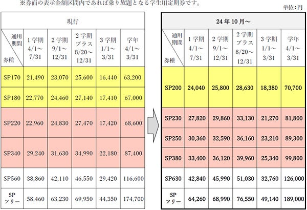 ・2024年10月1日以降に定期券を継続購入される場合は、改定後の運賃に基づいた定期券をご購入いただく必要がありますのでご注意ください。