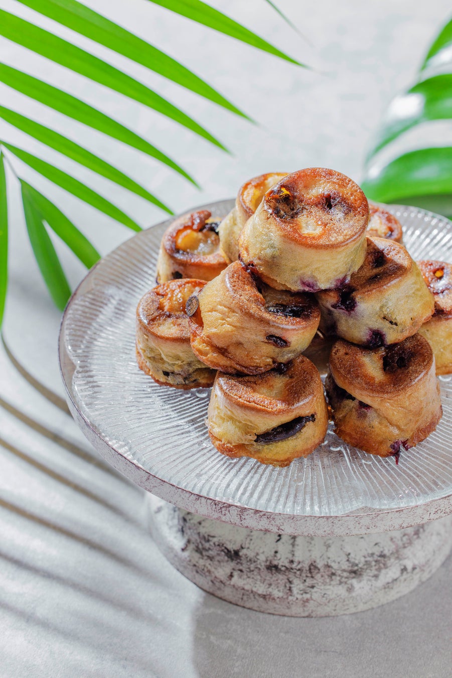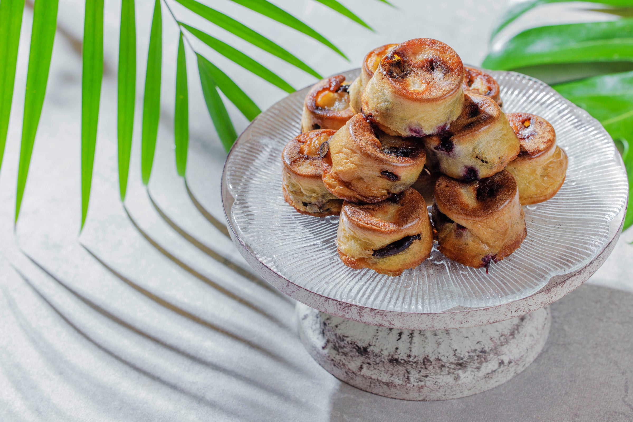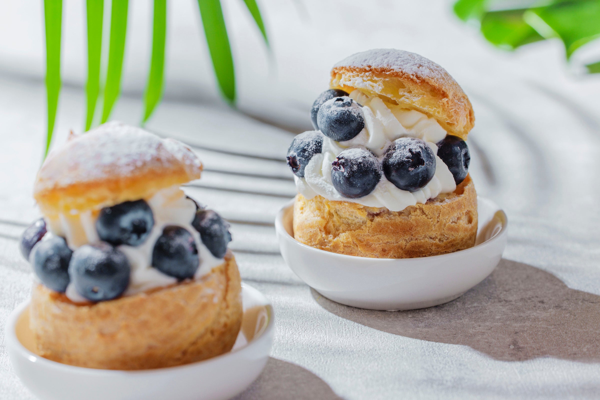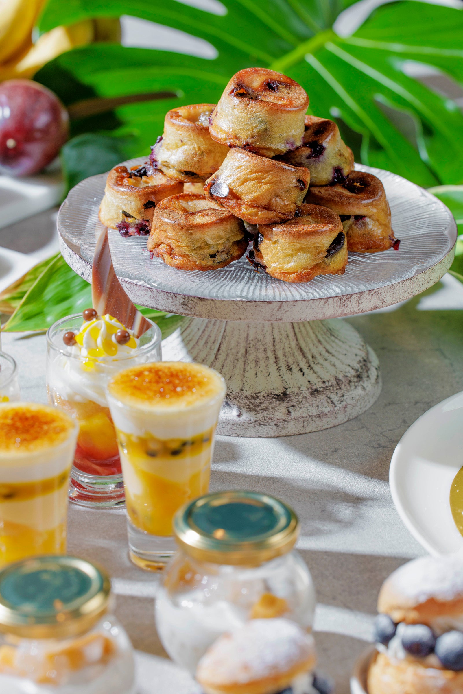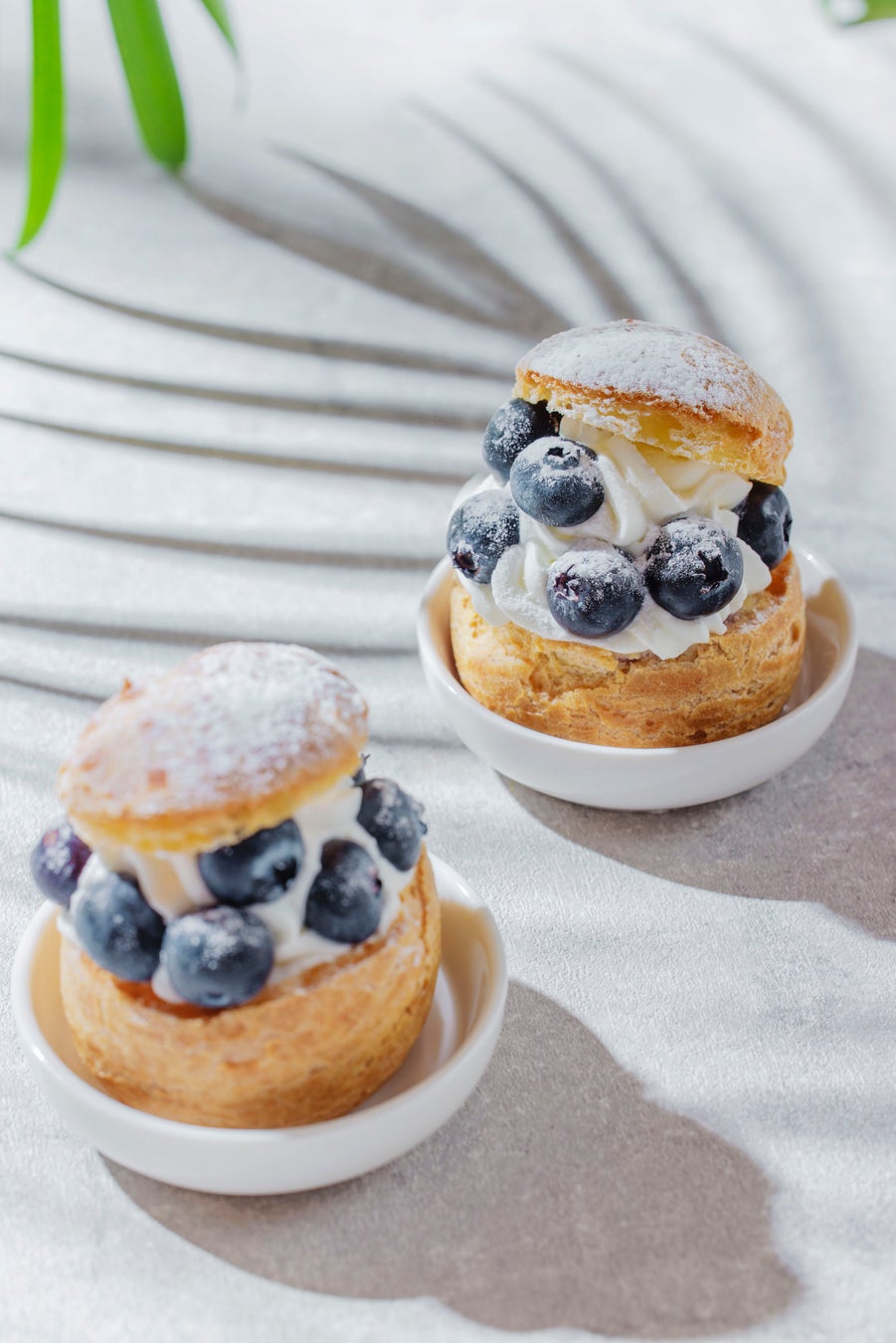 「ブルーベリーシュークリーム」は、芳醇なブルーベリージャムとなめらかなディプロマットクリーム、フレッシュなブルーベリーの爽やかなハーモニーをお楽しみいただけます。他にも、甘酸っぱいカシスと完熟プラムの濃厚な果実味、優しいミルク風味の生地が口に広がるフランス・ブルターニュ地方の伝統菓子「カシスとプラムのファーブルトン」など、グラスデザートから焼き菓子、ドリンクまで、バラエティ豊かにご用意します。
