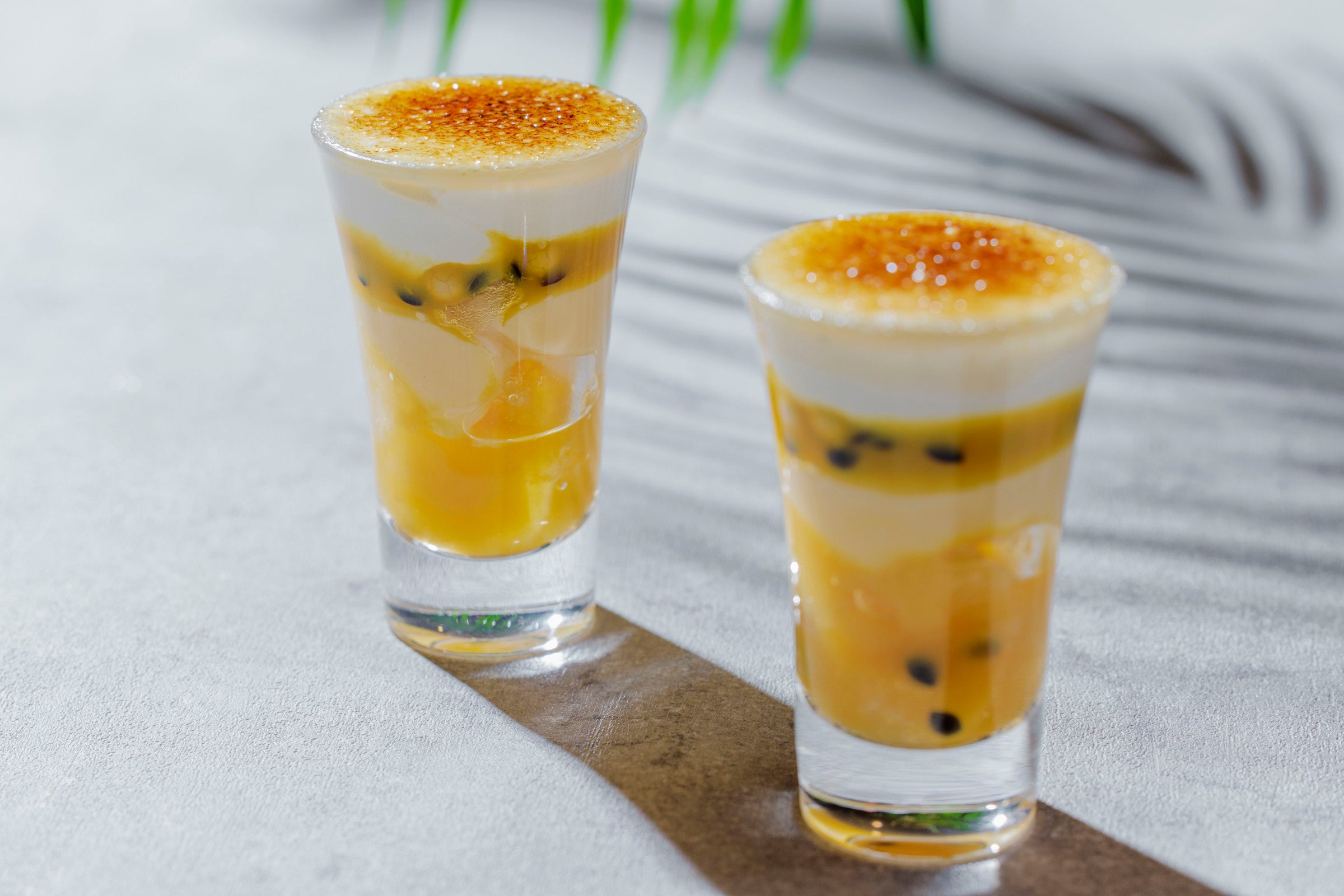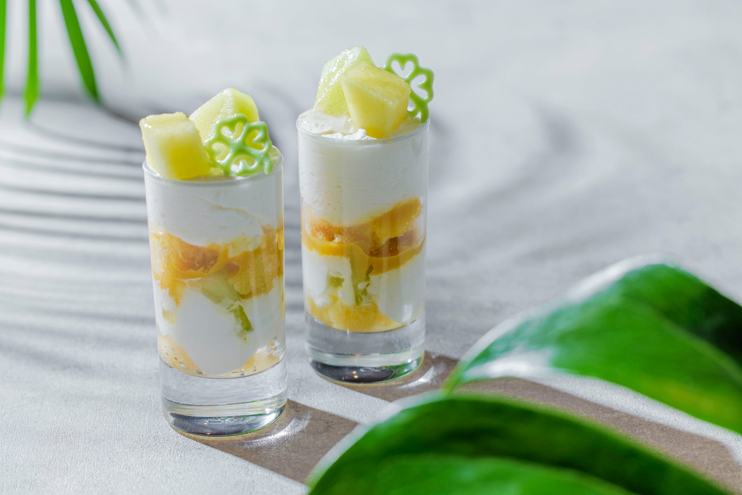 「ライムとパッションフルーツのキャラメリゼ」は、パッションフルーツソースの南国の香り豊かな風味と、ライムクリームの爽やかさ、グレープフルーツのジューシーな酸味が繊細に調和する夏らしい一品です。みずみずしいメロンにライチが香るスポンジ、マンゴーやバナナ、パッションフルーツのエキゾチックなソース、そしてふんわり仕上げた生クリームを層に重ねた「メロンのグラスショートケーキ」は、グラスの中に夏を閉じ込めたようなデザートに仕上げました。