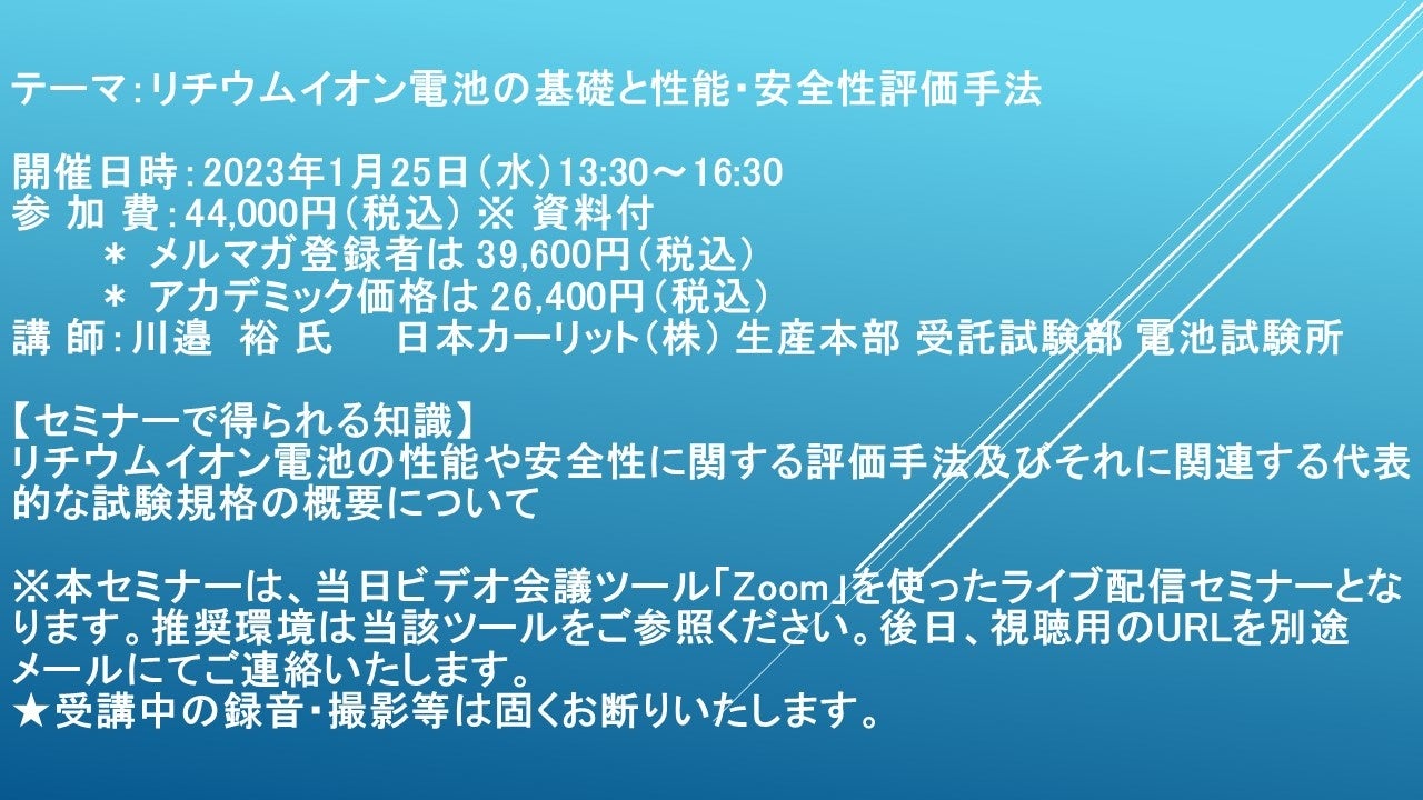 【ライブ配信セミナー】リチウムイオン電池の基礎と性能・安全性評価手法 1月25日(水)開催 主催:(株)シーエムシー・リサーチ