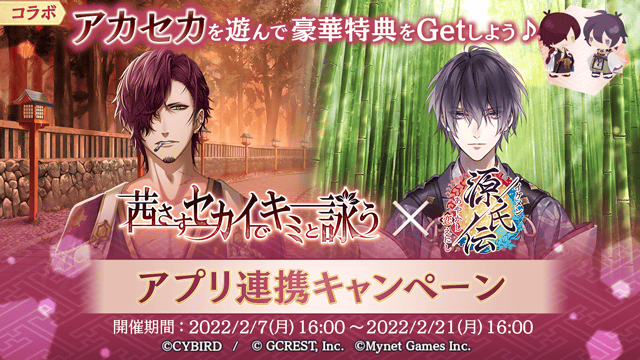 株式会社サイバード(本社:東京都渋谷区、代表取締役社長 兼 CEO 本島 匡、以下「サイバード」)の、全世界でのシリーズ累計会員数3,500万人を誇る女性向け恋愛ゲーム「イケメンシリーズ」の人気タイトル『イケメン源氏伝 あやかし恋えにし』は、株式会社ジークレストが手掛ける「和風ファンタジー×恋愛」パズルRPGゲーム『茜さすセカイでキミと詠う』(株式会社マイネットゲームス運営)とのコラボキャンペーンを開催します。