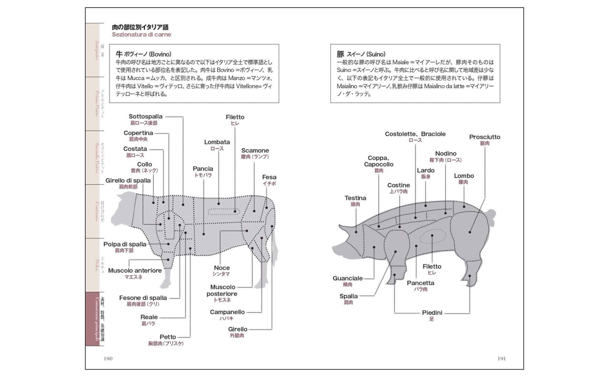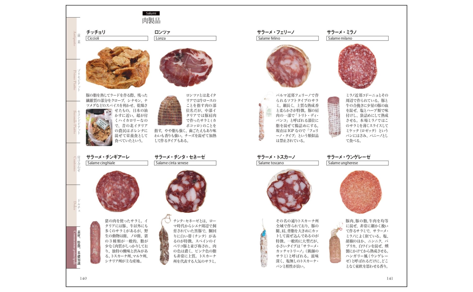 本書・第1部の料理名は日本語、イタリア語併記。登場順はポピュラーな料理からですが、巻末には五十音順、アルファベット順ともに索引があるので辞書替わりにも使えるのが高ポイント。旅先で役立つことはもちろん、国内リストランテの食べ歩きの予習復習の一冊に。また写真はイタリアでの撮影分が9割。リアルなイタリア料理の一端に触れることができます。