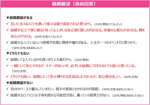 20~40代の未婚で子どもがおらずパートナーがいる男女のうち、結婚願望がある割合は57.2%で年々減少傾向である。しかし、年代によって傾向は大きく異なり、20代は74.8%、30代は60.3%、40代は37.1%と、20代と40代では2倍以上の差があり、若い年代のほうが結婚願望は高いことがうかがえる。結婚願望がある20代からは、「幸せになりたいから(26歳女性)」、「互いに支えあうことを通して様々な面で成長できると思うから(29歳男性)」、「結婚することで家に帰ると待っている人がいる安心感と寂しさがなくなる。老後の心配も少なくなる。親を安心させられる(27歳女性)」などの声もあがり、安心感や自己成長にもつながると考えているようだ。