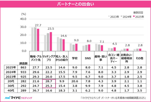 パートナーとの出会いのきっかけを聞くと、全体では「職場・アルバイト先(27.7%)」が前年から1.9pt減少するも、最多となった。一方で「マッチングアプリ(23.5%)」や「SNS(8.0%)」は2年連続で増加した。20・30代では、「マッチングアプリ」の割合が最多で、特に20代では約3割を占めている。【図1】