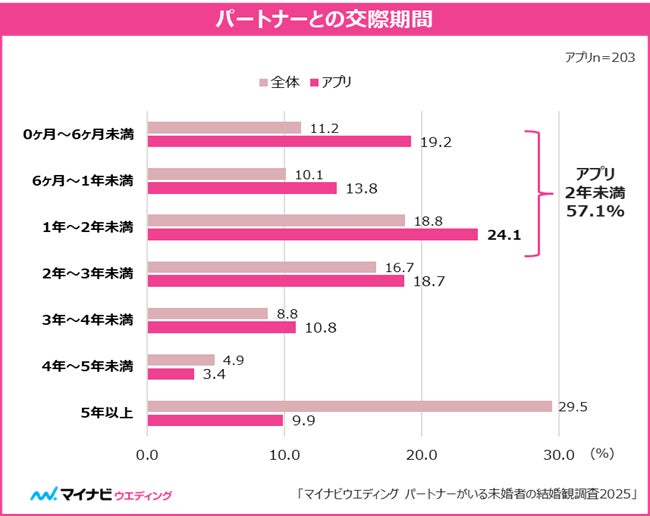 また、パートナーとの交際期間については全体でみると「5年以上」が多いが、マッチングアプリで出会った人の交際期間は、2年未満が57.1%であり交際期間が短い傾向であることがわかった。【図2】