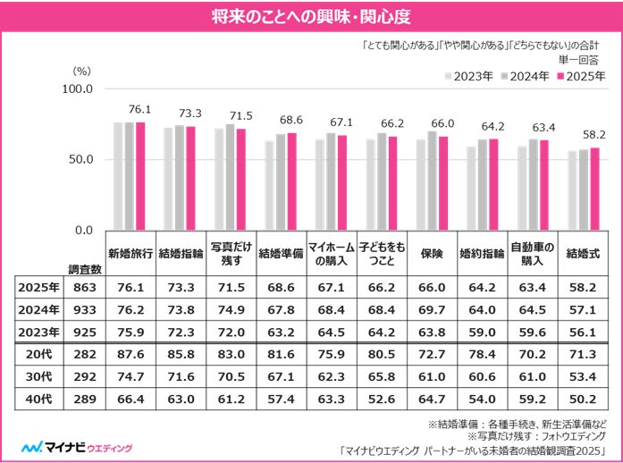 将来への興味・関心は前年に引き続き「新婚旅行(76.1%)」が最多となり、「結婚指輪(73.3%)」が続いた。また「結婚準備(68.6%)」と「結婚式(58.2%)」に関しては、2年連続増加した。【図5】