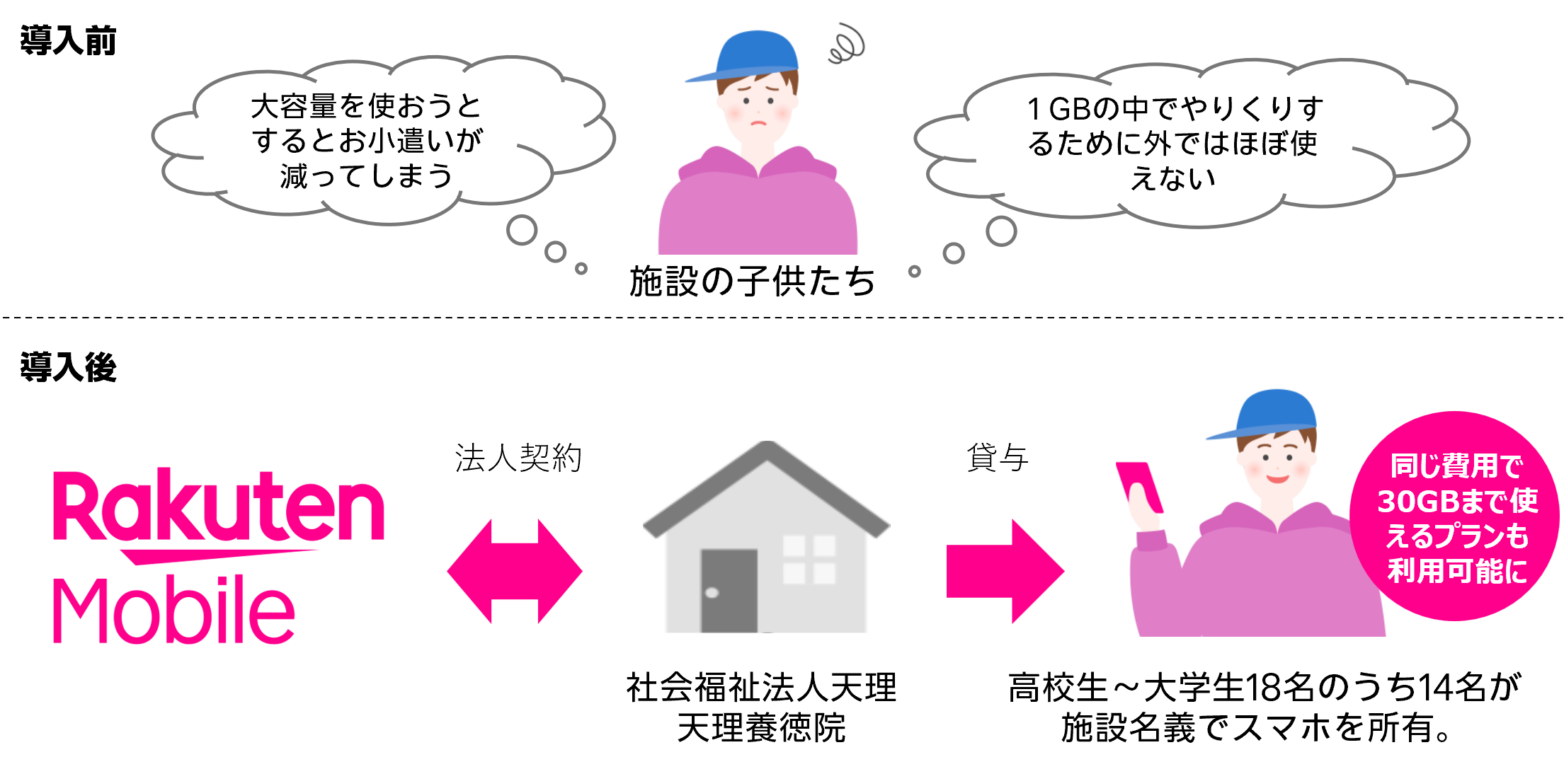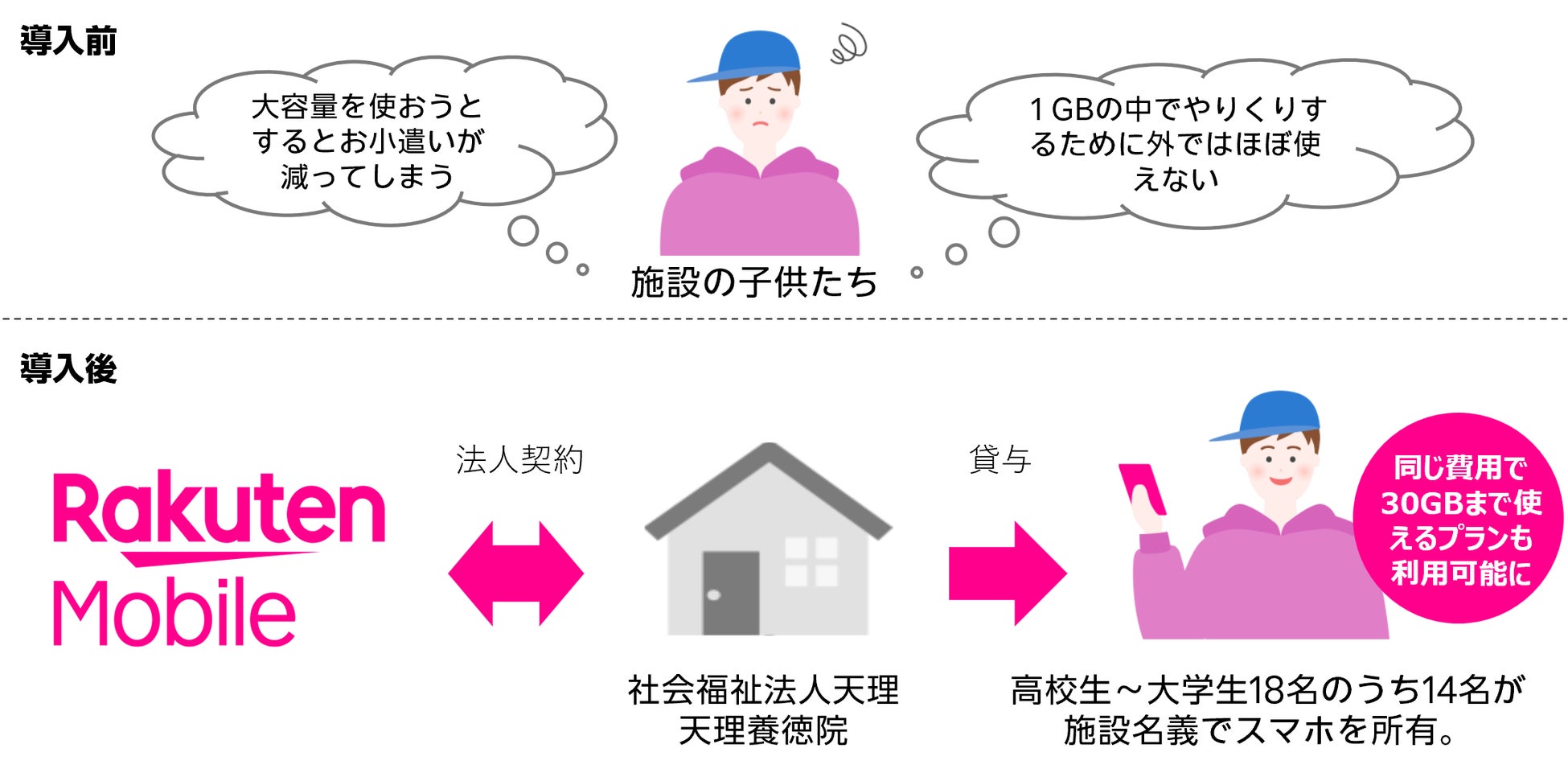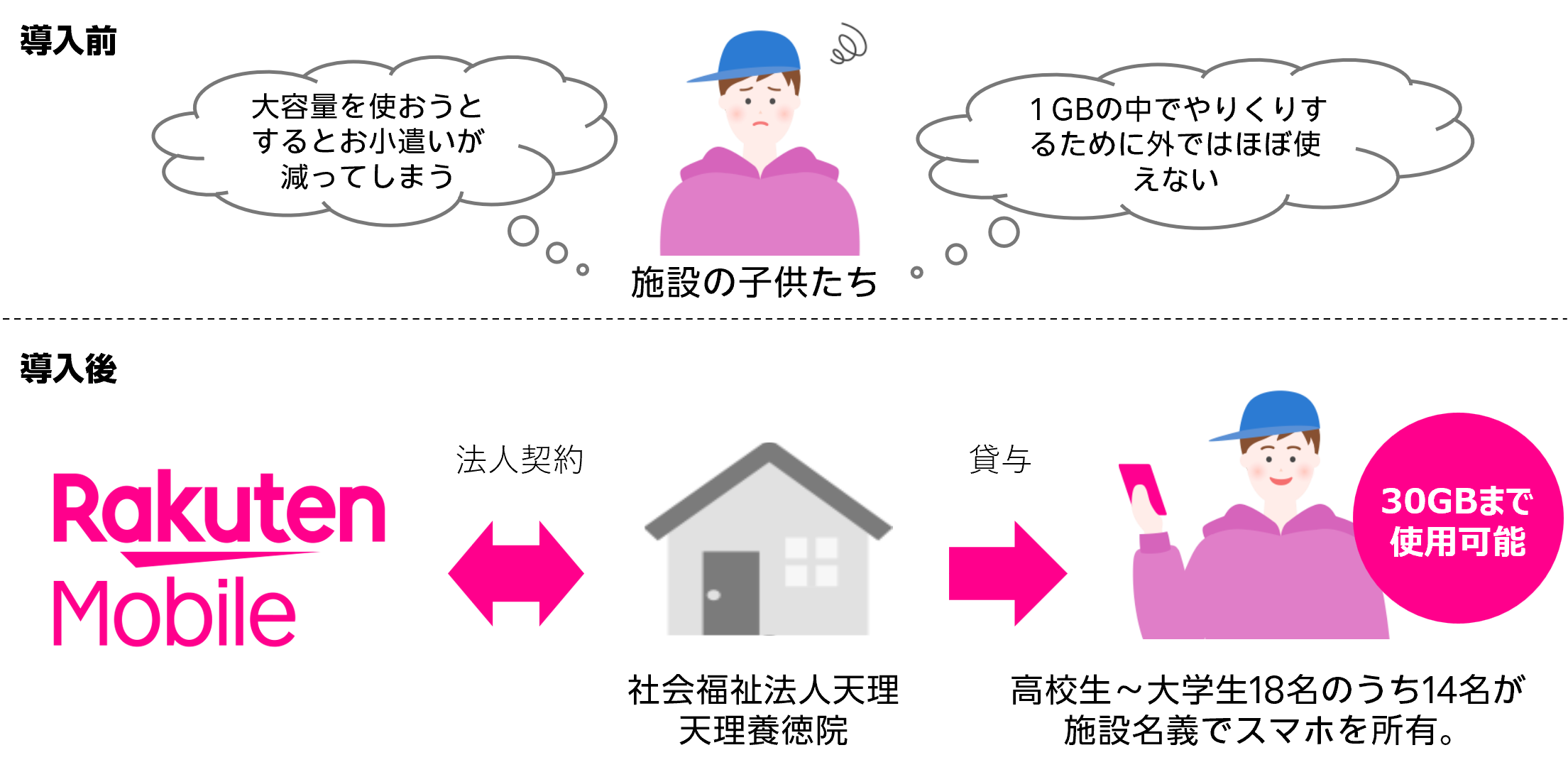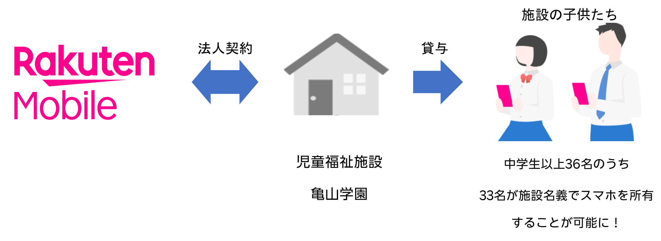 施設では、楽天モバイル 法人サービスを活用することで、個人で契約ができない子供たちも施設名義で法人契約が可能となり、保護者がいないことによる契約の障害を解決することが出来ました。