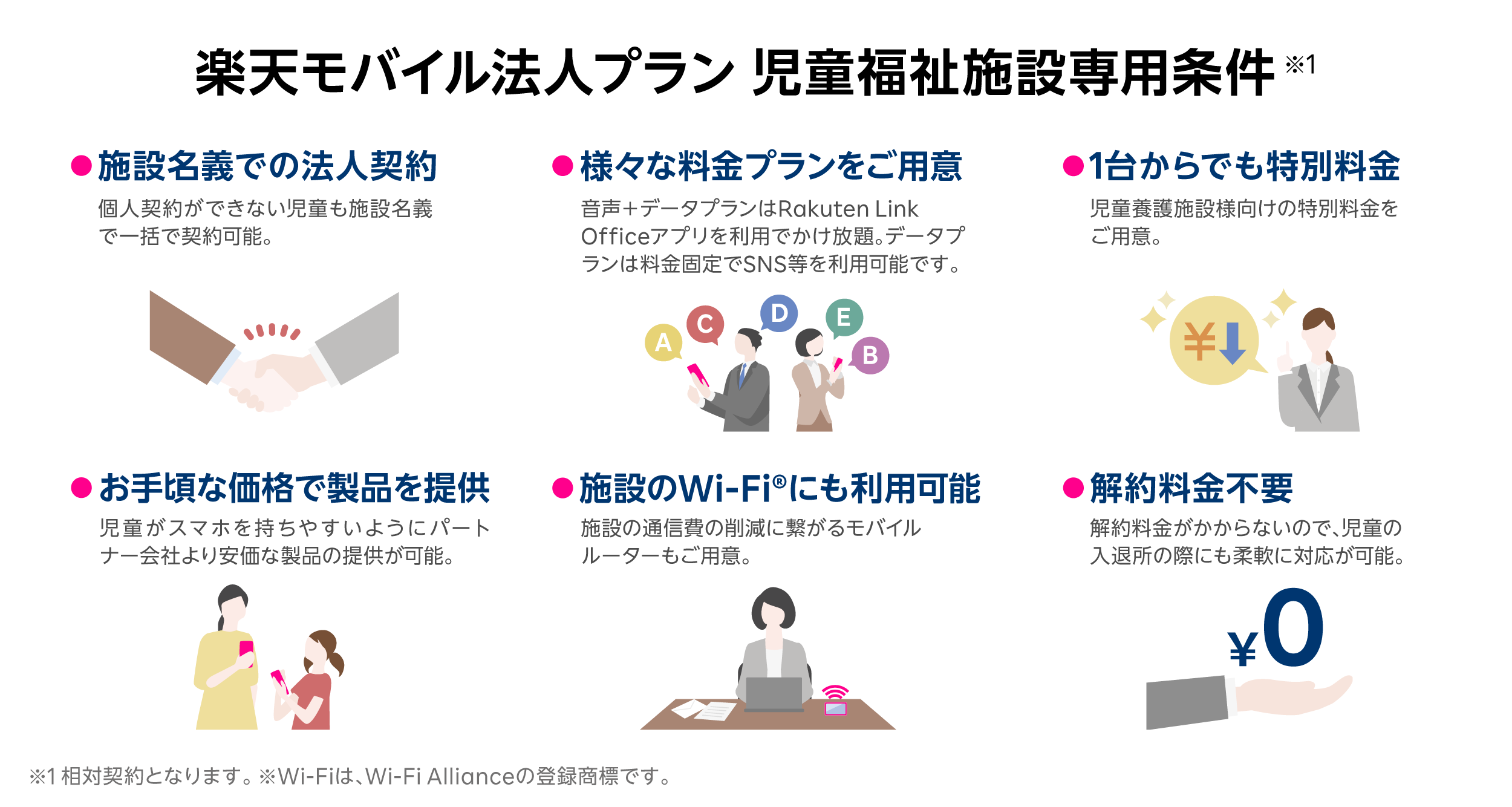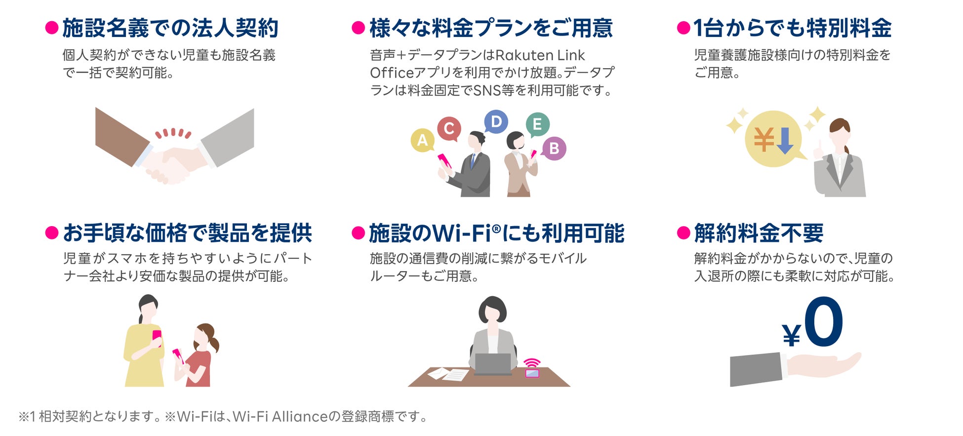 楽天モバイル 法人サービスでは、データ無制限やデータ専用プランなど、複数の低価格な料金プランを提供しています。また、1社で複数のプランを選択できるため、幅広い年代の子供たちがいる児童福祉施設でも、それぞれに最適なスマホおよび料金プランを選択できます。さらに、児童福祉施設向けの特典として契約事務手数料を無料にし、低価格な料金プランだけでなく初期費用を抑えることで、児童福祉施設側のスマホ支給に係るコスト負担の軽減を目指しています。