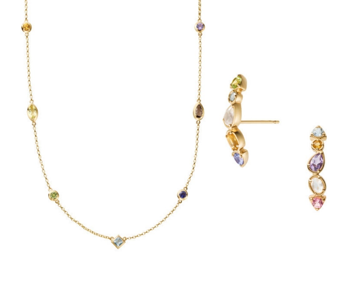 アメシスト、スモーキークォーツ、アイオライト、ブルートパーズ、ペリドット、レモンクォーツ、シトリンの7色のカラーストーンで、色とりどりの花々をイメージした「ヴァンドーム青山」のネックレス。カラーストーンのきらめきと透明感がゴールドのボリュームに抜け感をプラス。花束のようなエレガンスを演出します。