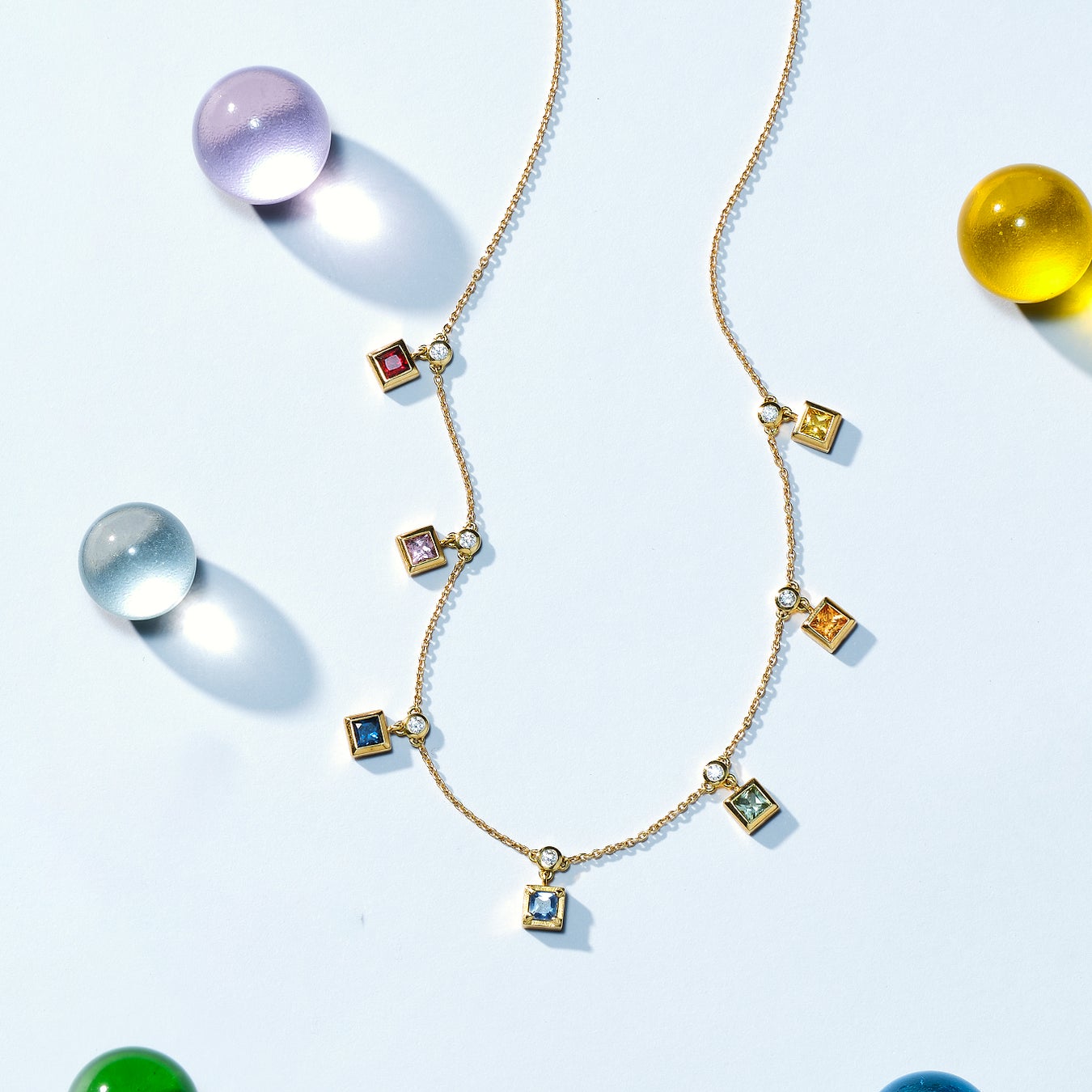 叡智の象徴でもあるサファイアをハウスアトリエで厳選し、職人が手作業で丁寧にセッティングしました。7色のサファイアはまるで虹のように輝き、胸元を個性的に彩ります。一本でも主役級の存在感ですが、お持ちのチェーンと重ね付けしてもサマになるバランスで仕上げた、ミラモアの自信作です。