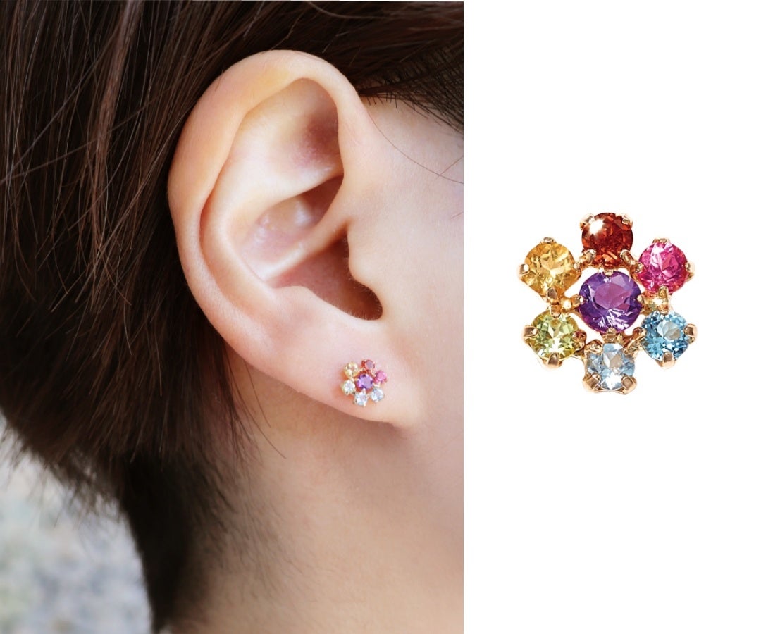ペリドット、アクアマリン、ムーンストーン、シトリン、タンザナイト、アメシスト、ピンクトルマリンの左右合わせて7色のカラーストーンをあしらったピアス。