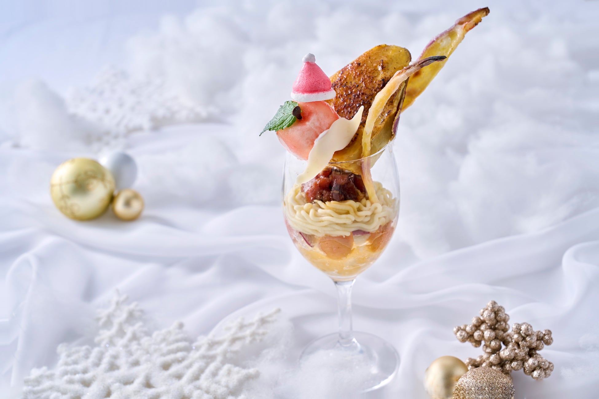 「サンタさんのスイーツグラス」は、芳醇なさつまいものクリームやキャラメリゼした焼き芋の香ば しさに、期間限定のサンタ帽が愛らしいアクセントになっています。